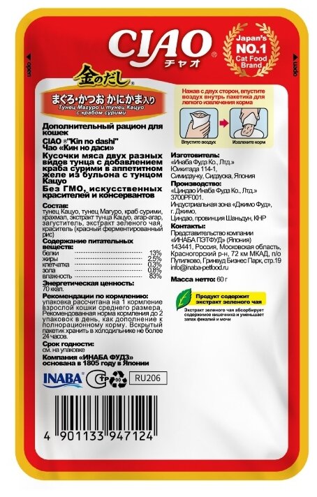 | Состав | тунец кацуо, тунец магуро, сурими со вкусом краба, дрожжевой экстракт, экстракт кацуобуси, экстракт водорослей, полисахариды, витамин Е, экстракт зеленого чая |