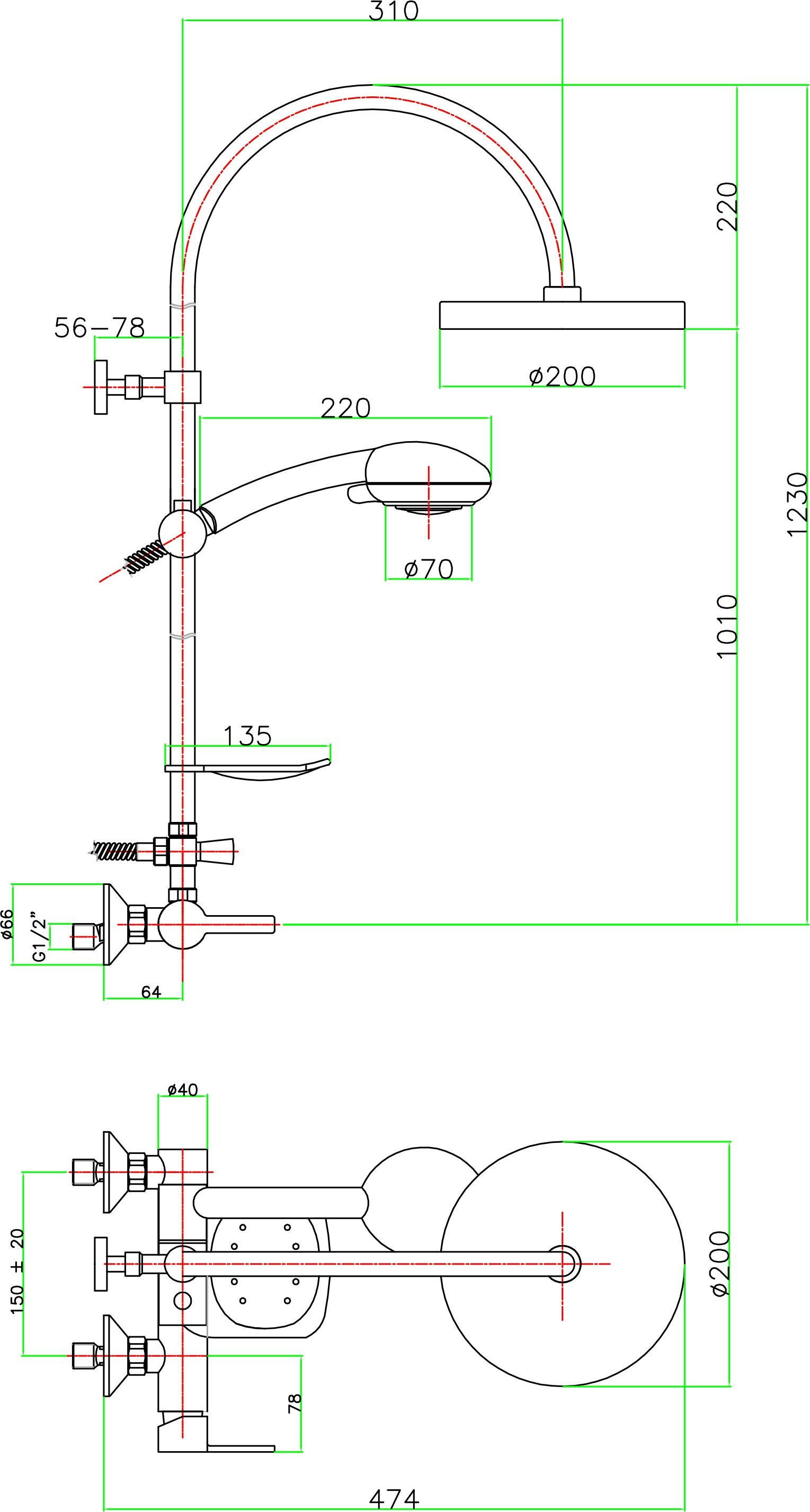 | Дополнительная информация | высота стойки для душа: 1230 мм; диаметр душевой лейки: 70 мм; диаметр верхнего душа: 200 мм |