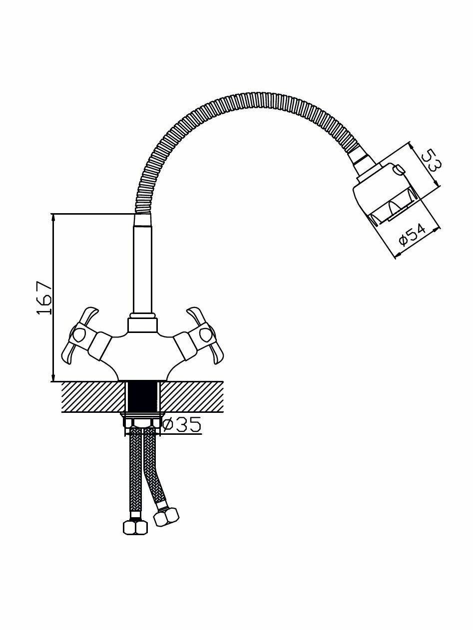 | Комплектация | смеситель, гибкий излив на гайке 3/4", насадка-аэратор два режима струи, крепёж на гайке, две гибкие подводки 1/2" длиной 35 см, паспорт изделия |