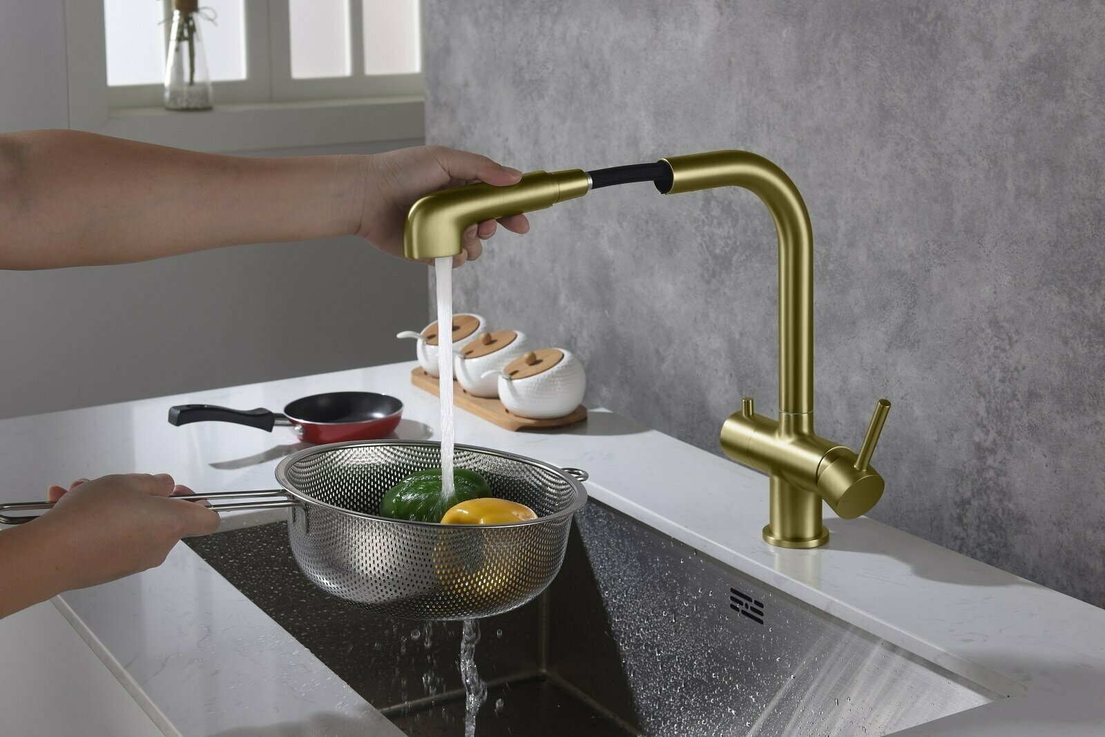 Смеситель для кухни с подключением фильтра и выдвижной лейкой Timo Saona 2346/17FL золото матовое