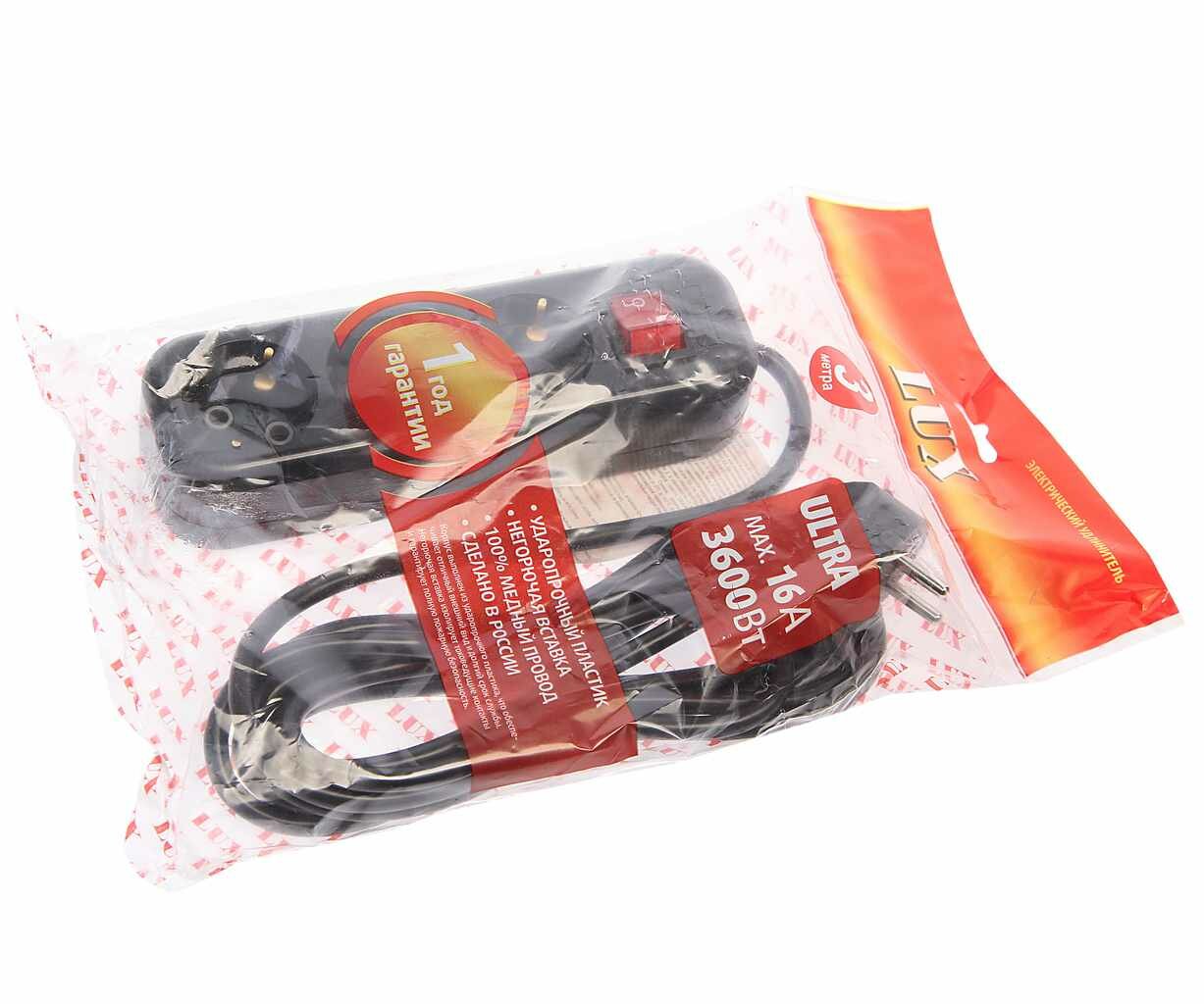 LUX Сетевой удл-ль LUX У3-ЕВК-03 черный с выключателем 3-местный с з/к, 250В 16А, 3м 4606400418207 .