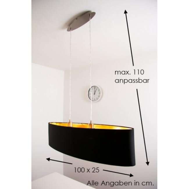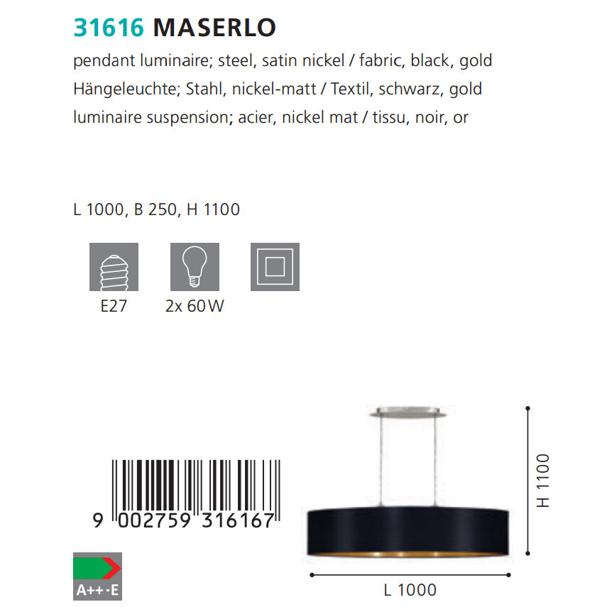 Подвес MASERLO, 2х60W (E27), 1000х250, H1100, никель мат./текстиль, черный, золотой