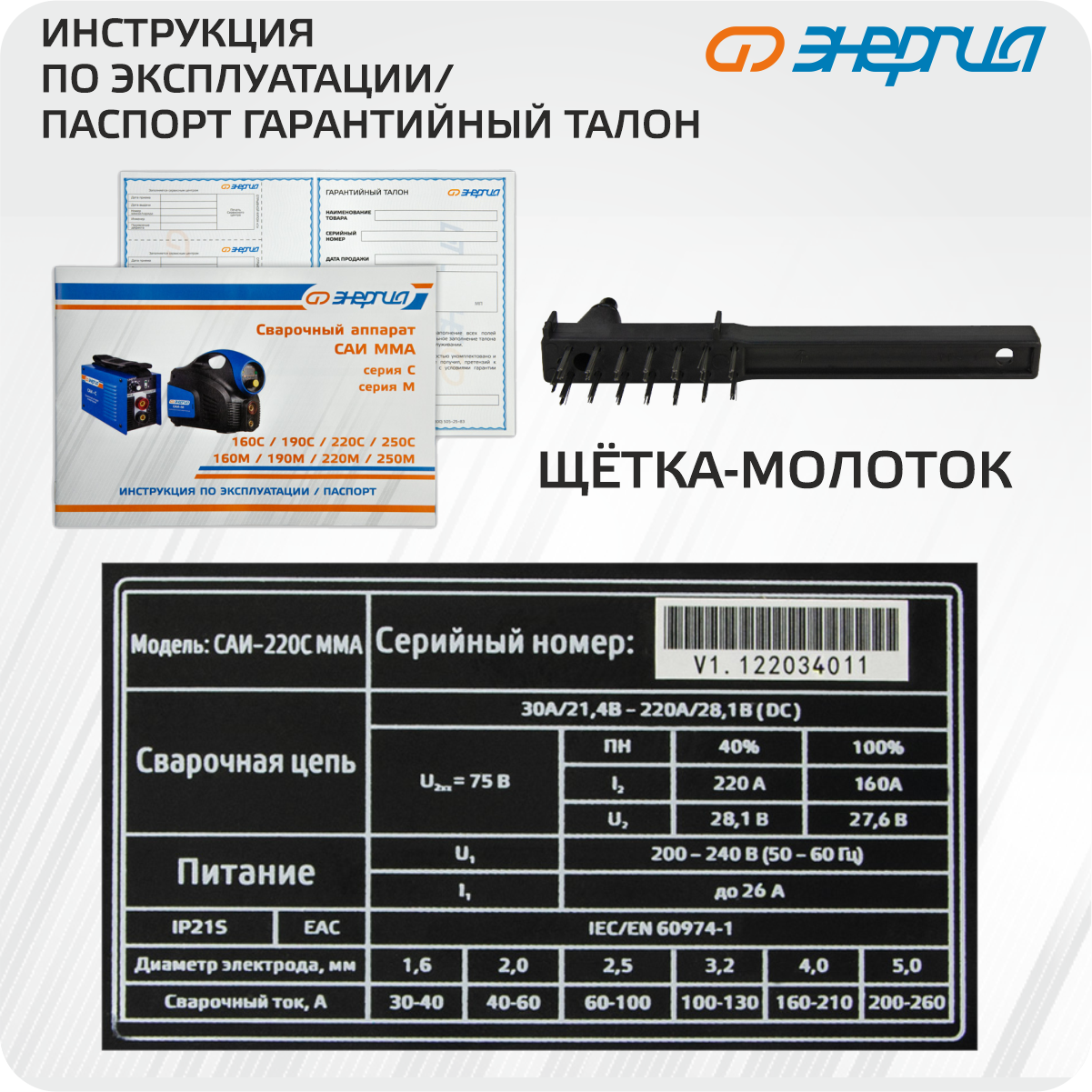 | Комплектация | сварочный аппарат инверторный САИ ММА Энергия, сварочный кабель с зажимом, сварочный кабель с электрододержателем, защитная маска с затемненным стеклом, щётка–молоток, инструкция по эксплуатации/паспорт, упаковка |