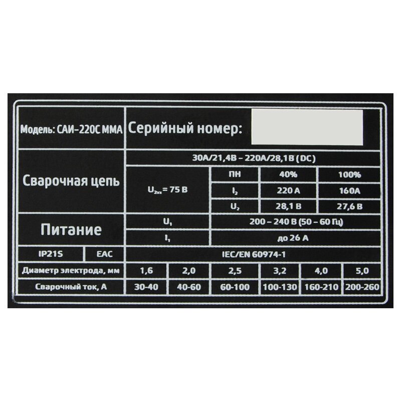 | Сварочный ток (MMA), max | 220 А |
