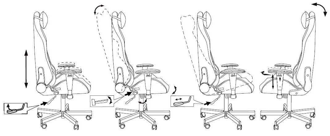 | Регулировка | высоты подголовника / высоты подлокотников / высоты поясничного упора / высоты сиденья / глубины сиденья / наклона спинки |