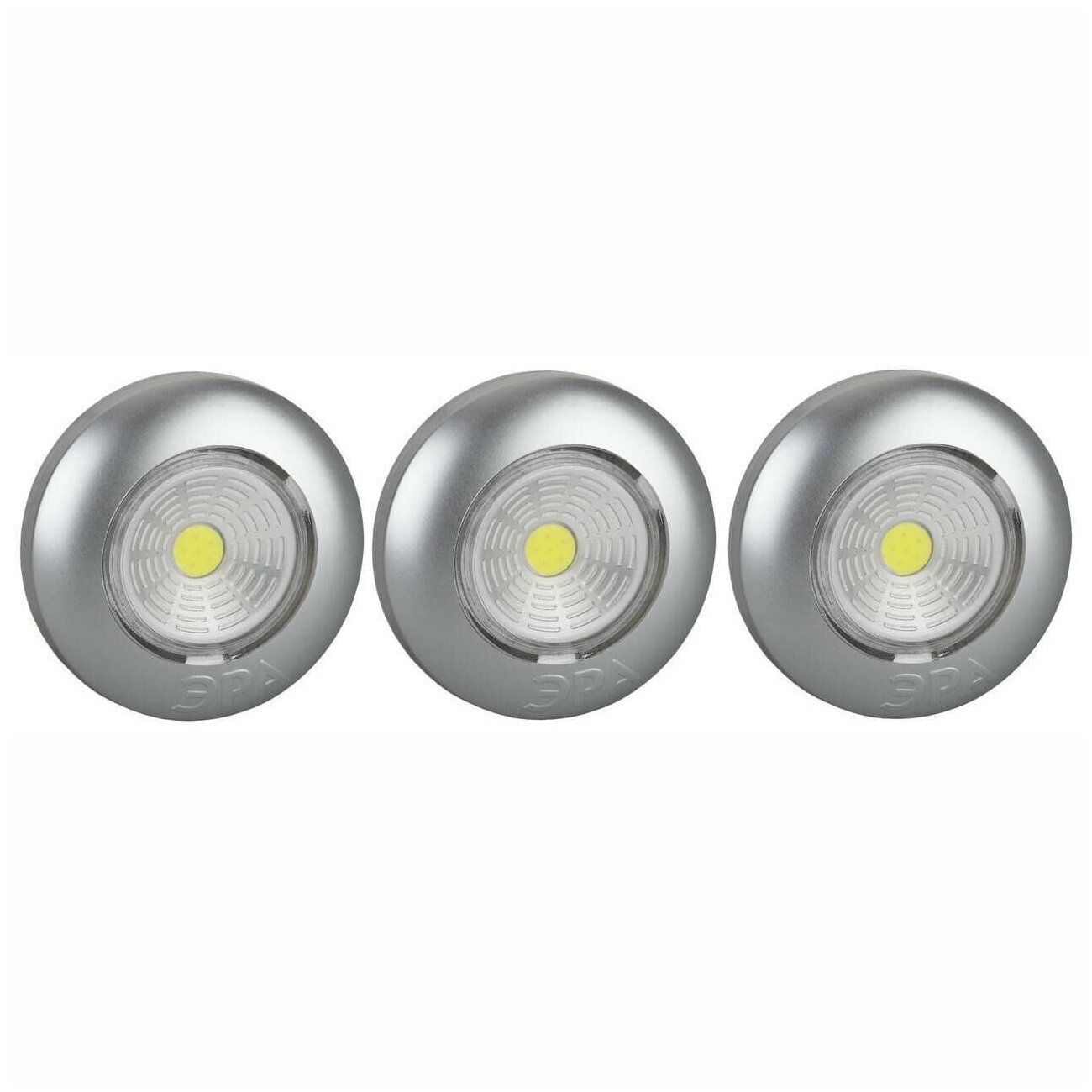 Купить Комплект настенных светильников Эра "Аврора" серебристый , питание от 3 мизинчиковых батареек/аккумуляторов, самоклеющаяся поверхность, COB диод, мощность 3 Вт, время работы - до 90 часов. , дальность 5 метров. световой поток 70 Лм., упаковка 3 шт.