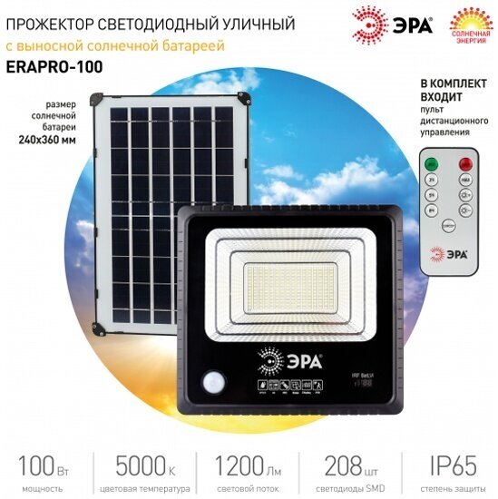 ЭРА Прожектор светодиодный уличный на солн. бат. 100W, 1200 lm, 5000K, с датч. движения, ПДУ, IP65 (