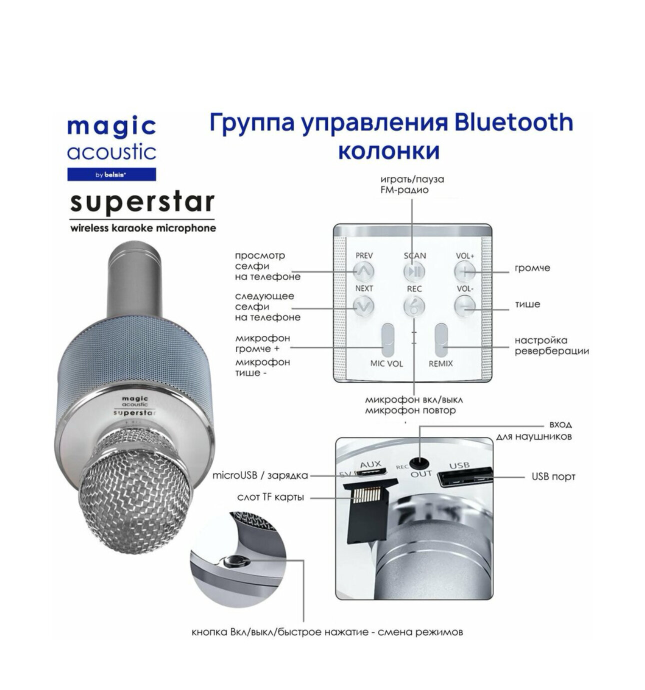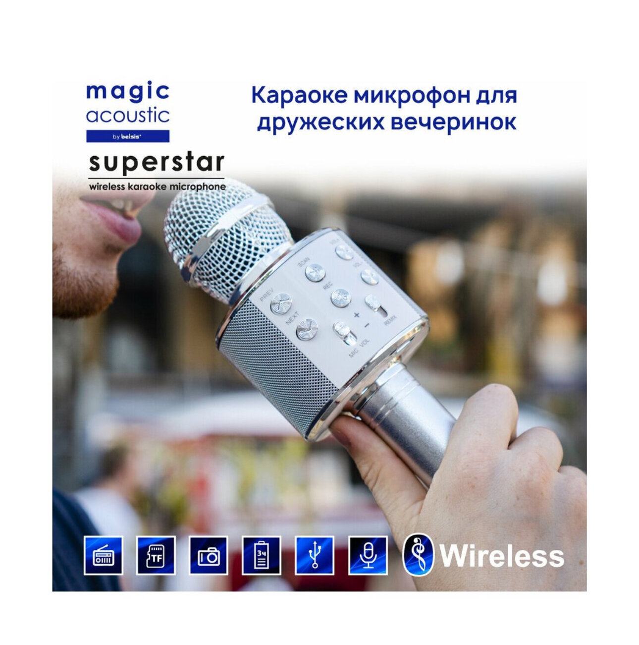 Купить Караоке Микрофон Блютуз Magic Acoustic Superstar/Bluetooth микрофон для Девочек Мальчиков Взрослых/Караоке 3-в-1/MA3001SR Superstar, серебряный