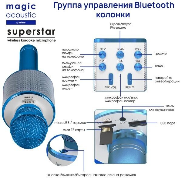 Караоке Микрофон Блютуз Magic Acoustic Superstar/Bluetooth микрофон для Девочек Мальчиков Взрослых/Караоке 3-в-1, синий