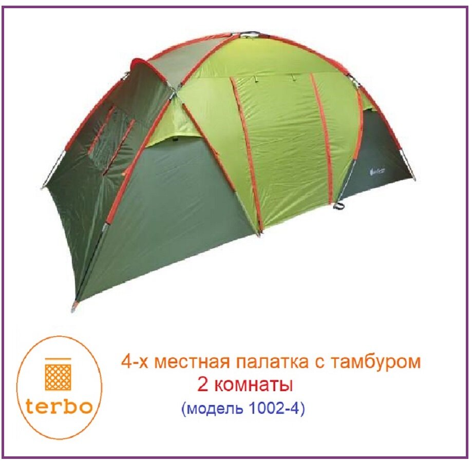 Палатка 4-местная, 2 отдельных комнаты, (2 слоя) дуги стекловолокно, вес 8.9 кг. ART1002-4 (Зеленая) интересное: