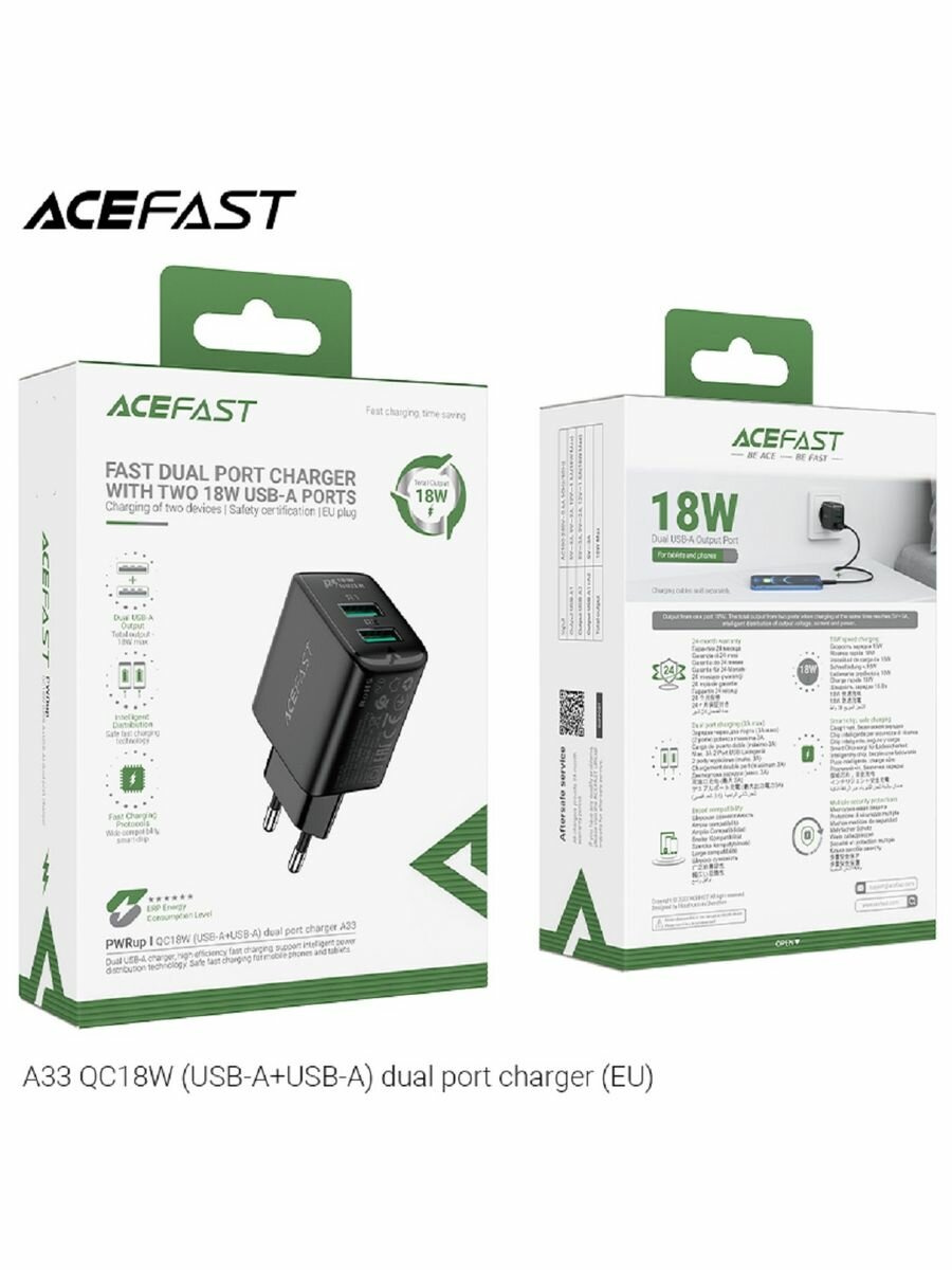 Зарядное устройство двухпортовое ACEFAST A33 QC18W USB-A+USB-A dual port charger (EU). Цвет: черный