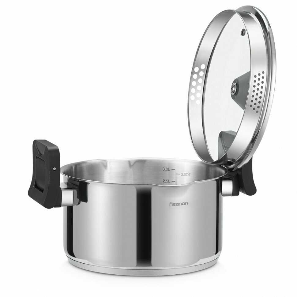 5246 FISSMAN Кастрюля TITANIA 2,5л; 18x11 см с крышкой (нерж.сталь) Ручки - бакелит; Крышка - стекло; Индукция; Термоаккумулирующее многослойное дно.