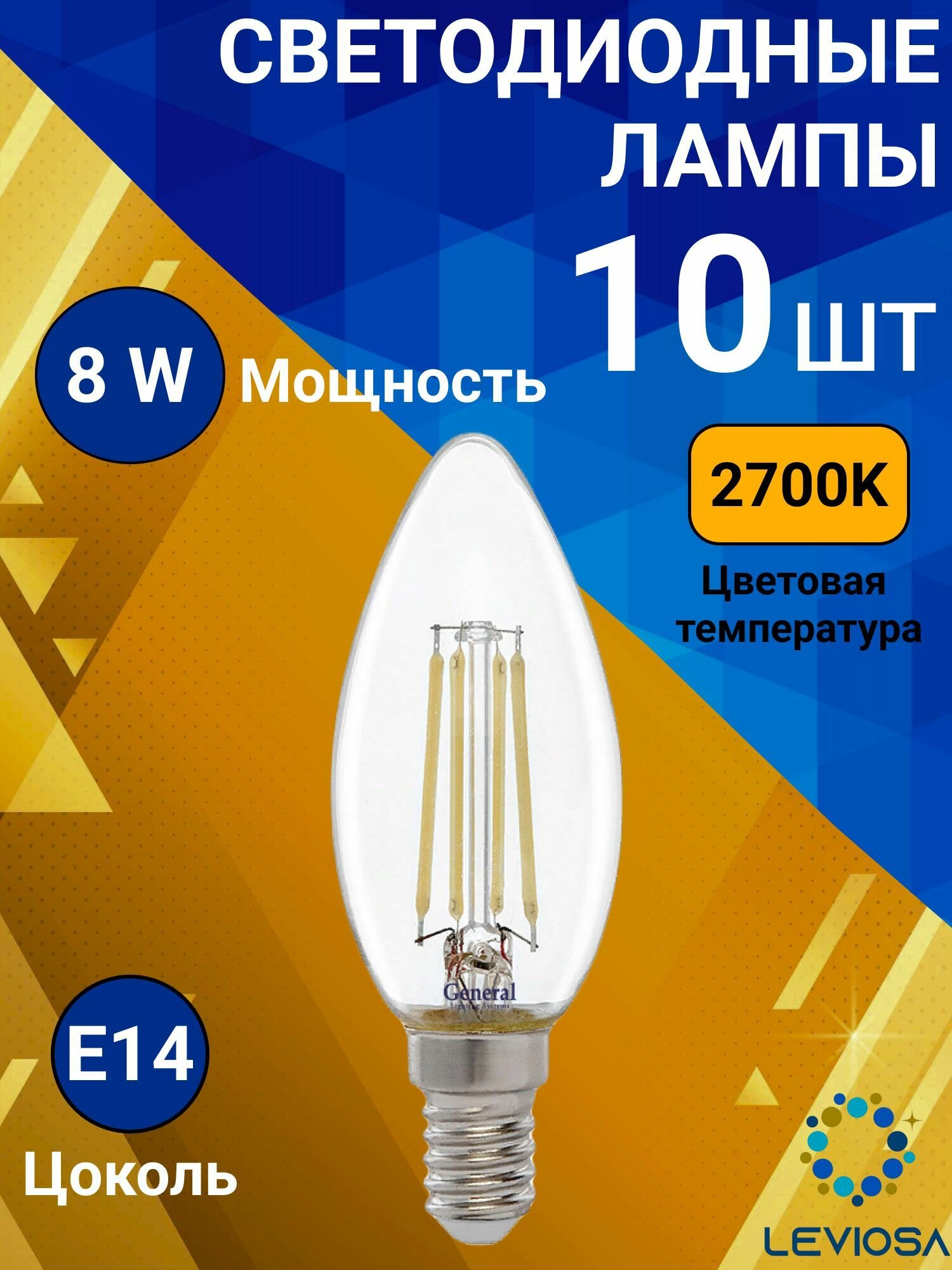 Купить General, Лампа светодиодная филаментная, Комплект из 10 шт., 8 Вт, Цоколь E14, 2700К, Форма лампы Свеча
