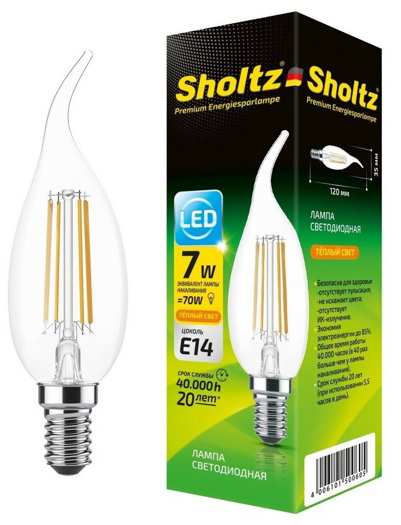 Лампа светодиодная энергосберегающая Sholtz 7Вт 220В свеча на ветру CA E14 2700К стекло филаментная (Шольц) FOC5006 интересное: