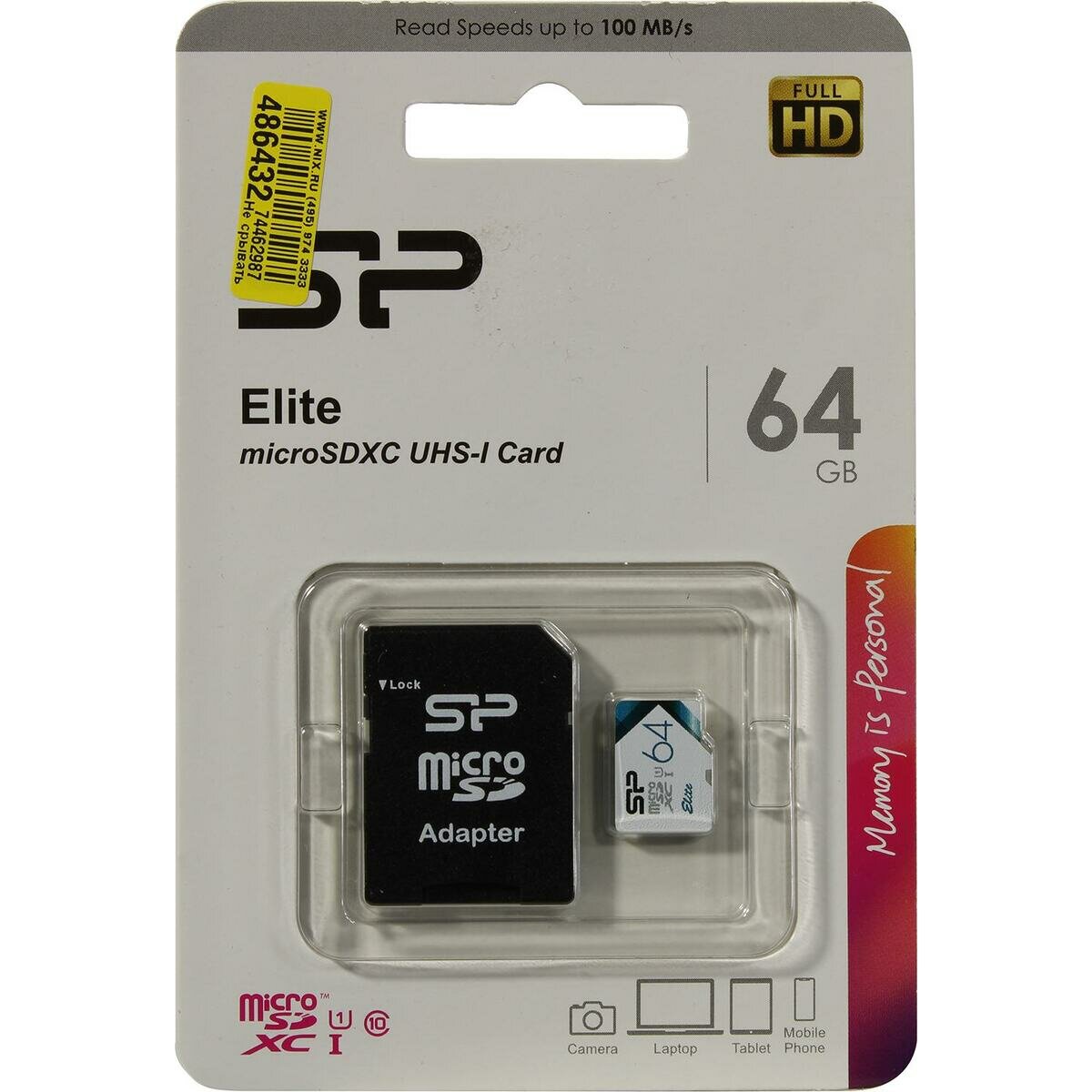 Карта памяти 64Gb MicroSD Silicon Power Elite + SD адаптер (SP064GBSTXBU1V21SP)