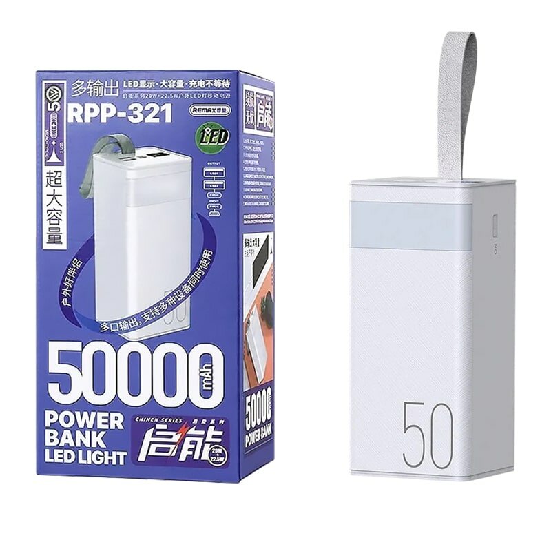 Ниже Вы можете прочитать отзывы на Внешний аккумулятор универсальный Remax RPP-321 50000 mAh Chinen series Super Fast Charg 22.5W/PD20W/QC3.0 power bank (2USB:5V-3.0A Max) Белый, ознакомится с подробными характеристиками, посмотреть интересные обзоры и фотографии на Внешний аккумулятор универсальный Remax RPP-321 50000 mAh Chinen series Super Fast Charg 22.5W/PD20W/QC3.0 power bank (2USB:5V-3.0A Max) Белый.