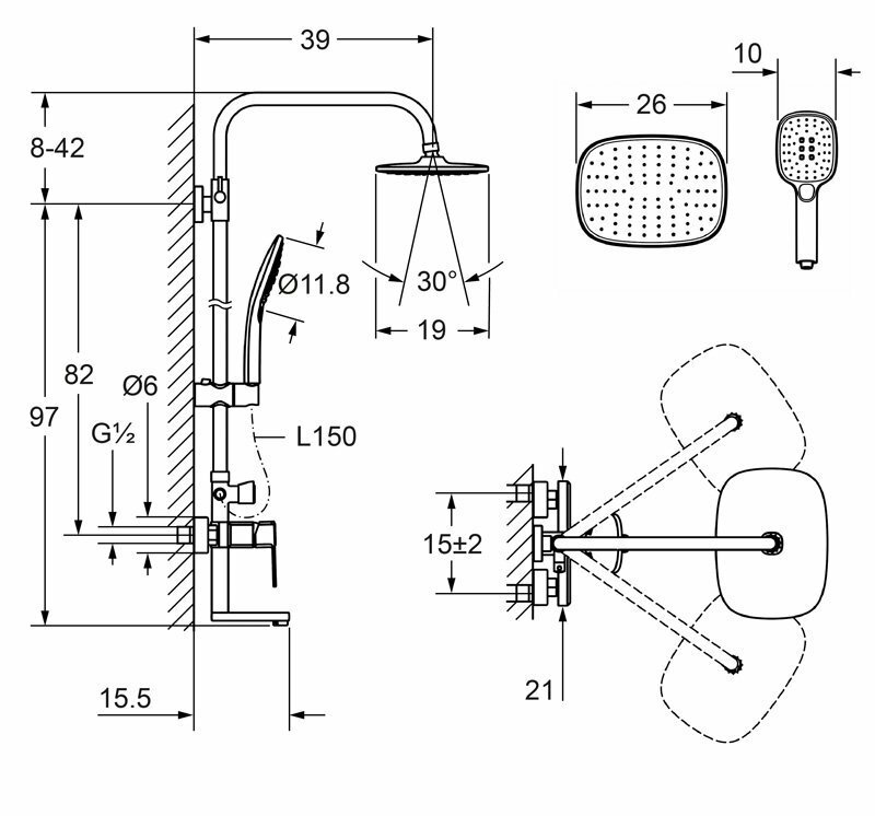 | Дополнительная информация | размер верхнего душа 26 см; размер лейки 10 см; вылет верхнего душа 39 см; количество режимов струи 1 |