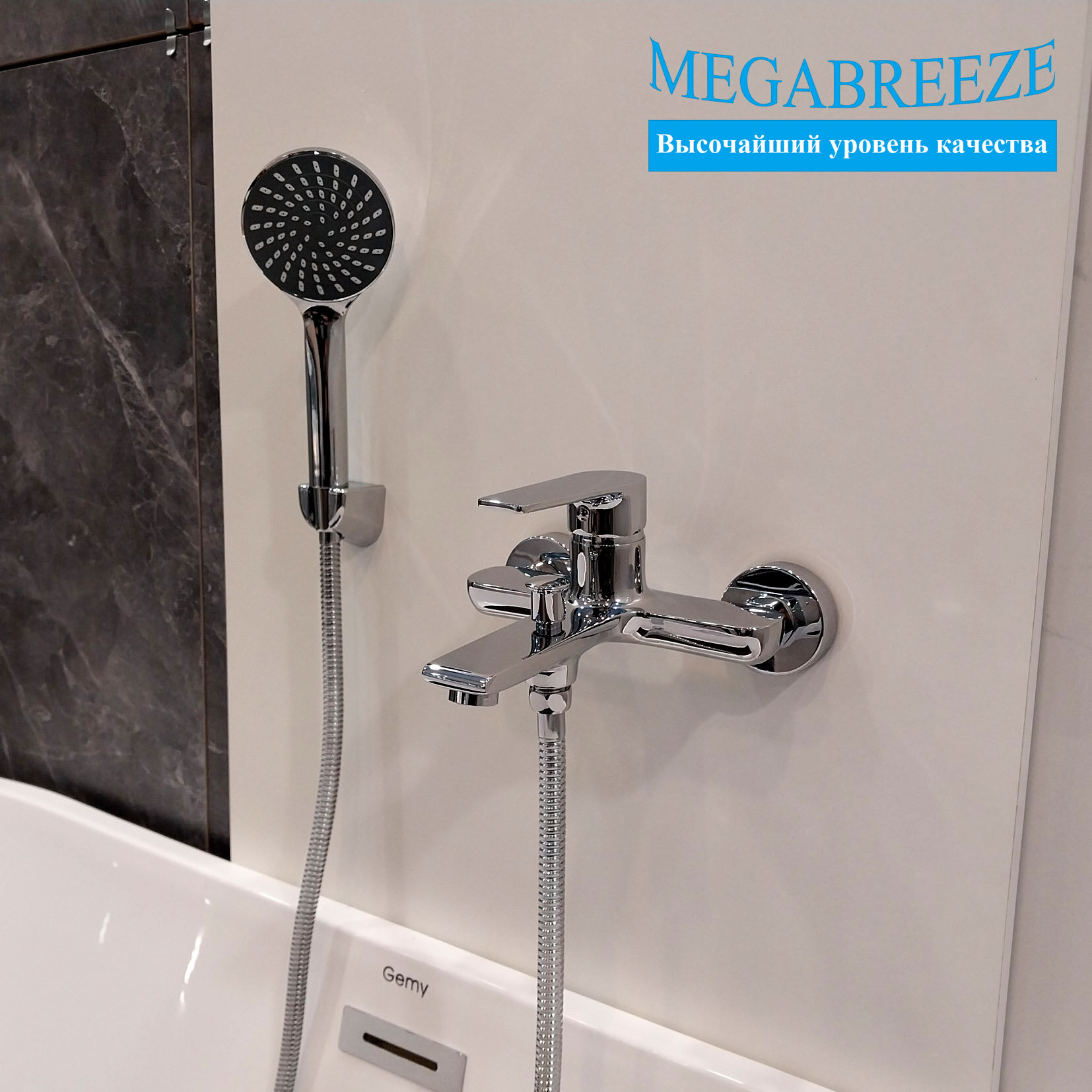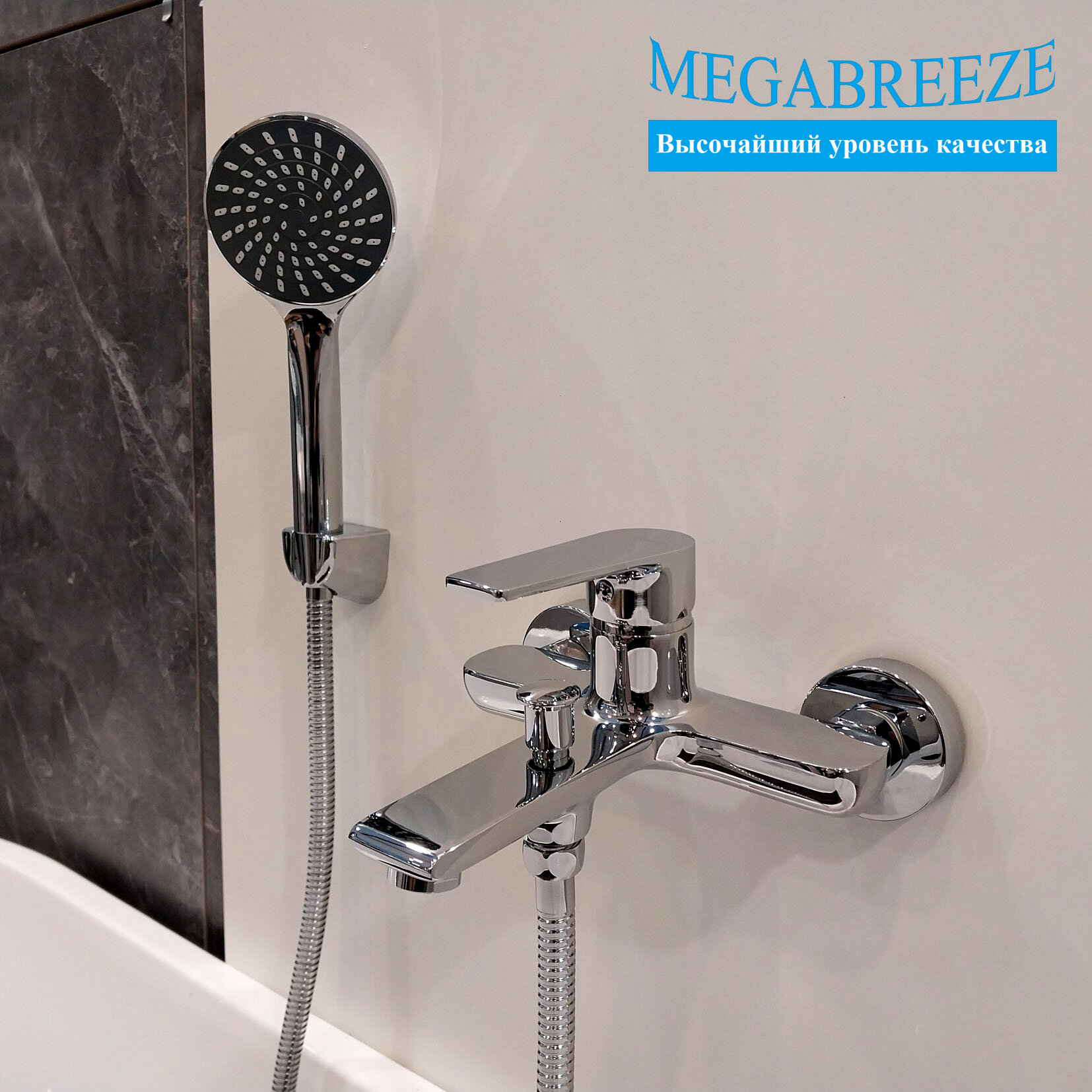 Смеситель MEGABREEZE для ванны КС-31-020, с мет. шлангом 1.5 м, с лейкой - 5 режимов струй, с кронштейном, коллекция Лорето интересное: