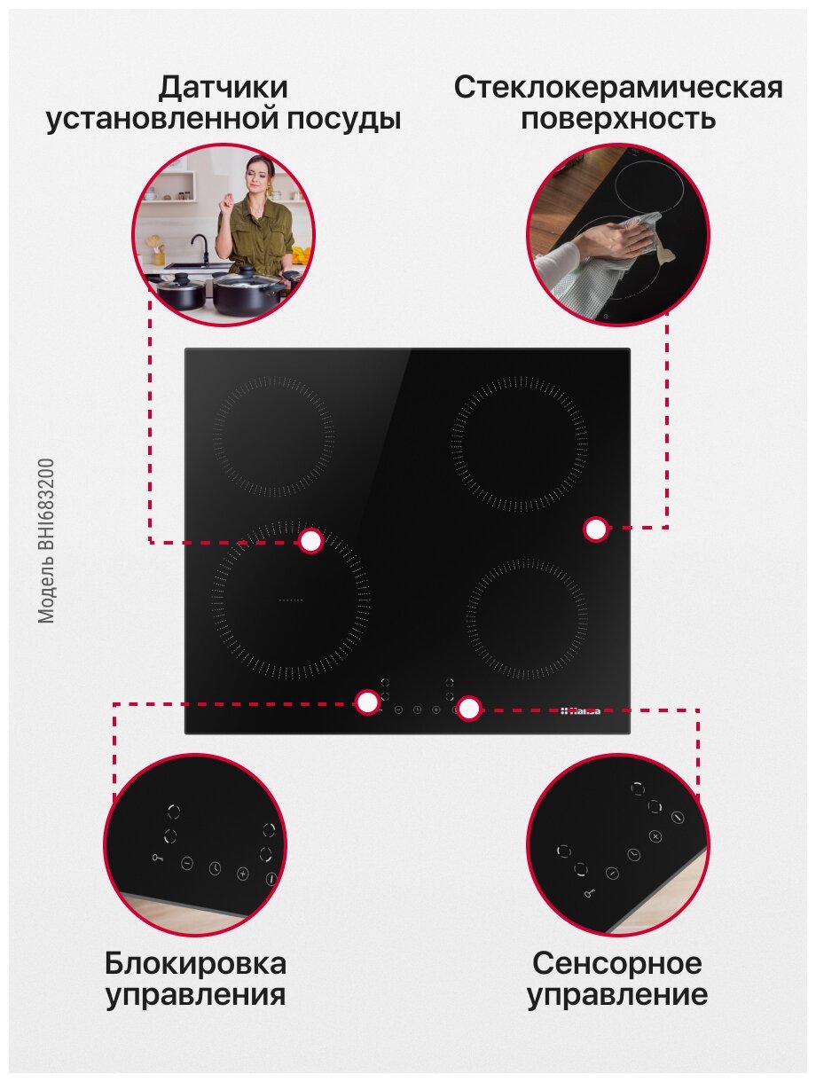 Индукционная электрическая варочная панель Hansa BHI683200, встраиваемая, 60 см, функция блокировки управления, звуковой таймер, стеклокерамическая поверхность с сенсорным управлением