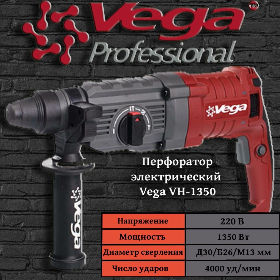 Перфоратор Vega Professional VH 1350, патрон SDS, 3Дж, 1350Вт, 4000уд/мин