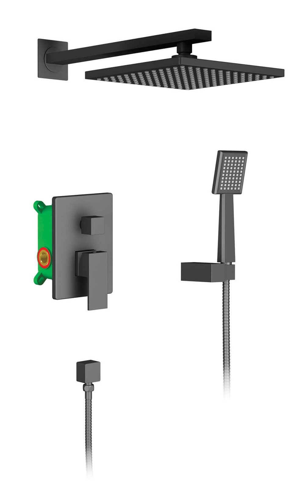 | Комплектация | смеситель с монтажной коробкой - 1 шт. / штанга тропического душа - 1 шт. / тропический душ (пластик) - 1 шт. / ручная лейка (пластик) - 1 шт. / держатель ручной лейки (пластик) - 1 шт. / декоративная накладка смесителя - 1 шт. / ручка дивертора - 1 шт.; / ручка управления смесителем - 1 шт. / шланг душа 1,5 м - 1 шт. / отвод из стены - 1 шт |