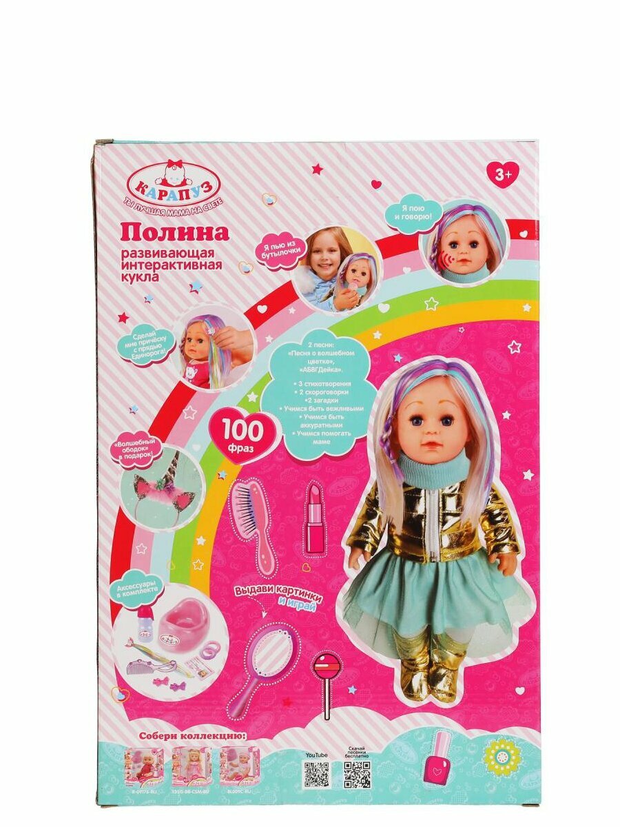 Кукла классическая функциональная полина 35см с цветными прядями, 9 аксессуаров, 100 фраз карапуз Y35SBB-UNC-38499 интересное: