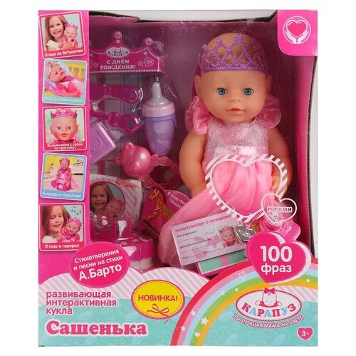 Пупс функц ОЗВ, ТМ Карапуз, Сашенька 40см, пьет, писает, закр.глазки, 100 фраз А.Барто интересное: