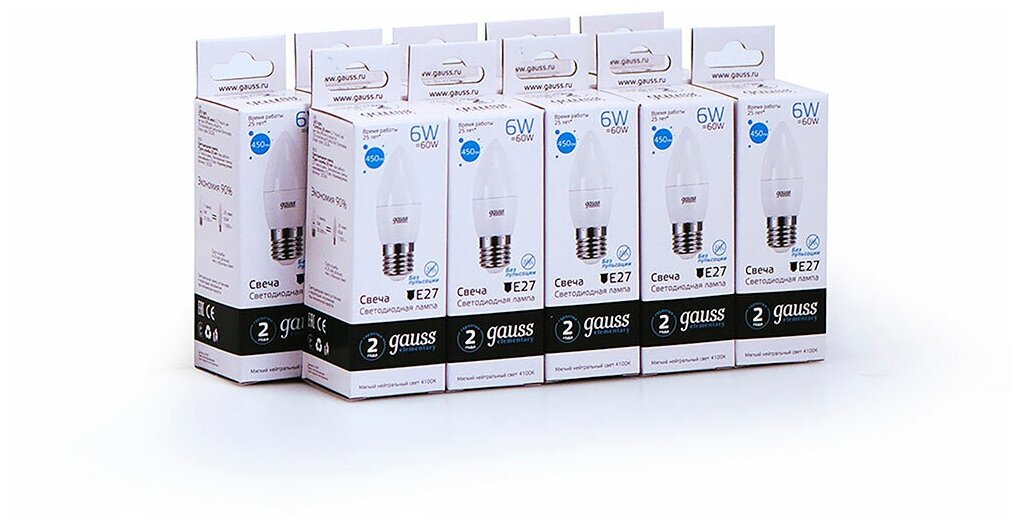Упаковка ламп 10шт Gauss Elementary Свеча 6W 450lm 4100K Е27 LED интересное:
