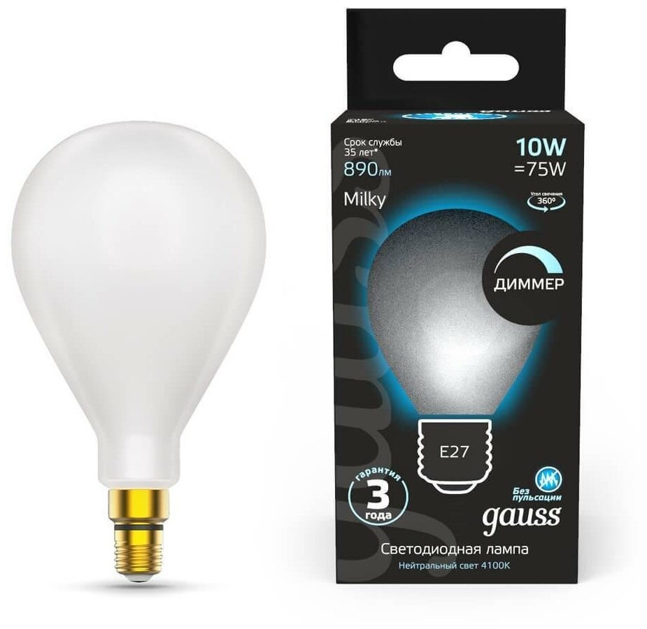 Светодиодная лампа Gauss Filament А160 10W 890lm 4100К Е27 milky диммируемая LED 1/6