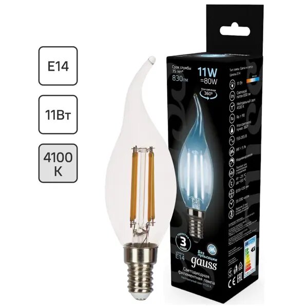 Лампа светодиодная Gauss LED Filament E14 11 Вт свеча на ветру прозрачная 750 лм, нейтральный белый свет интересное: