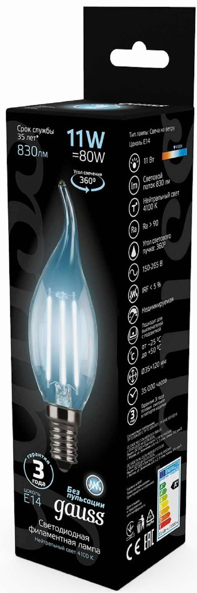 Купить Лампа светодиодная Gauss LED Filament E14 11 Вт свеча на ветру прозрачная 750 лм, нейтральный белый свет