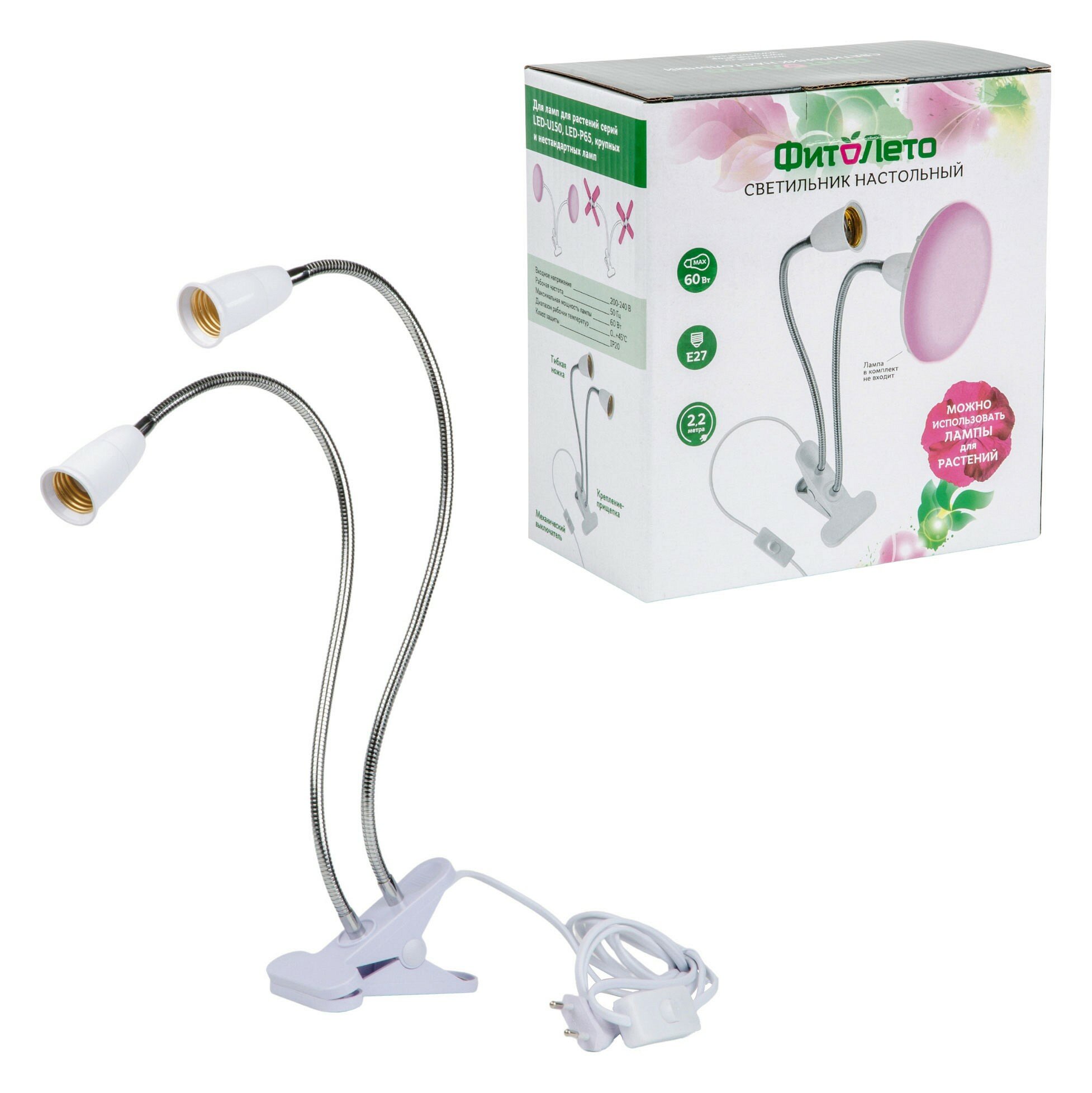 ФитоЛето Светильник на прищепке для фитоламп 2xE27 белый, выкл. на проводе TLI-281 WHITE E27x2 PLANT