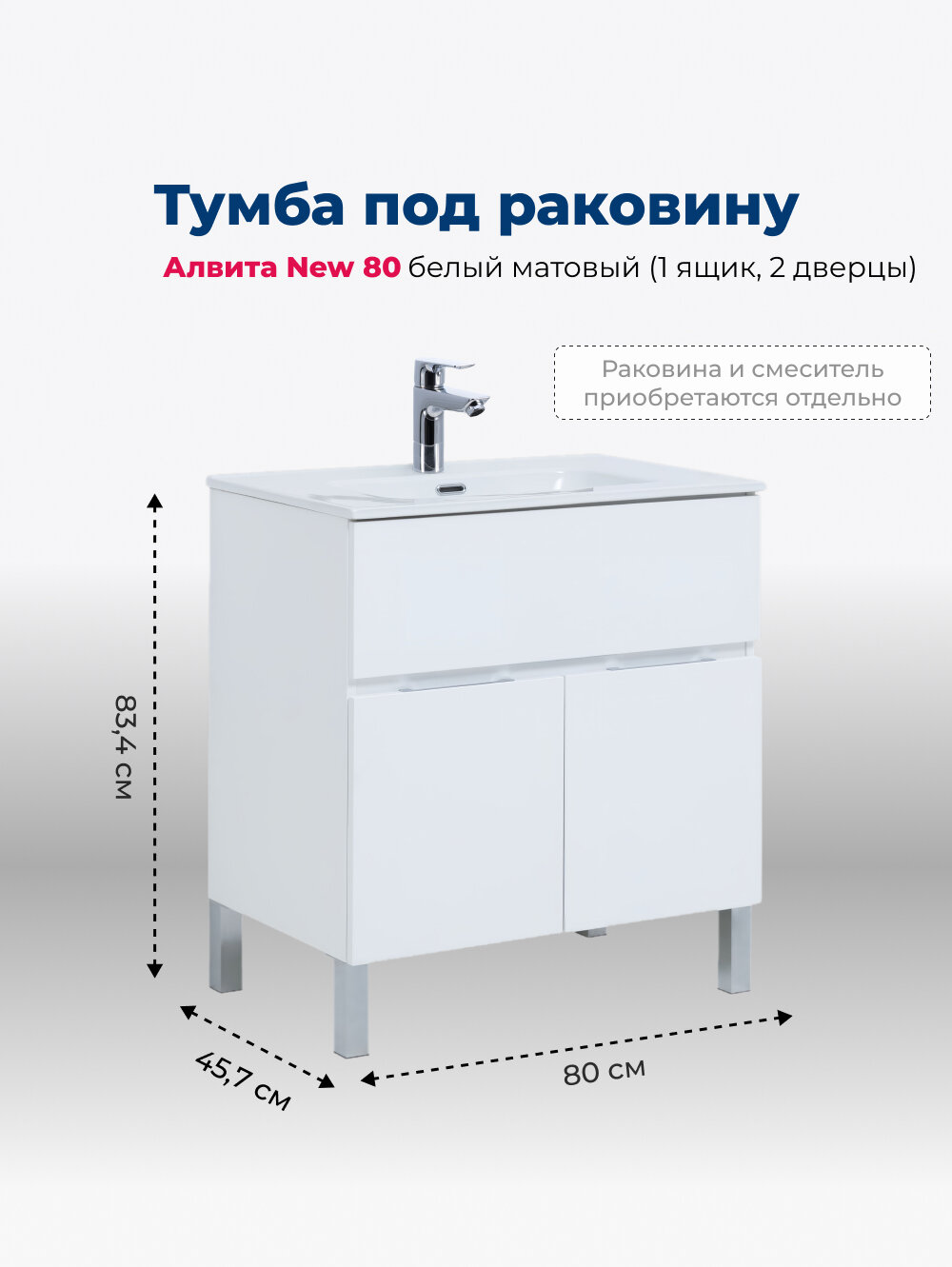 | Комплектация | Тумба Алвита new 80 напольная 1 ящ., 2 дв.цв.белый матовый (277550), раковина в комплект не входит |
