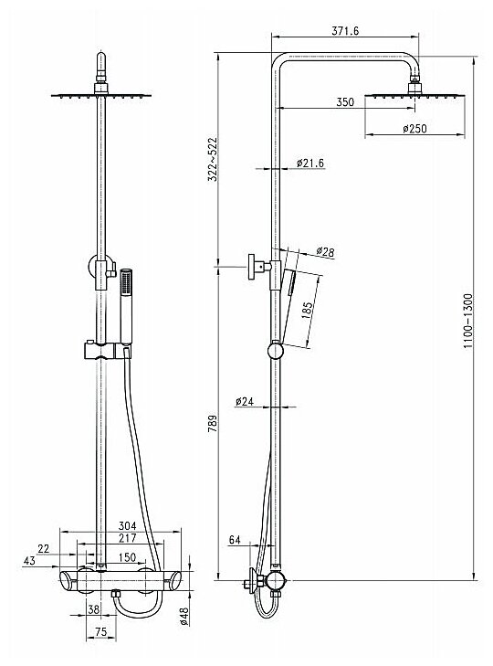 | Дополнительная информация | высота стойки для душа: 1300 мм; диаметр верхнего душа: 250 мм |