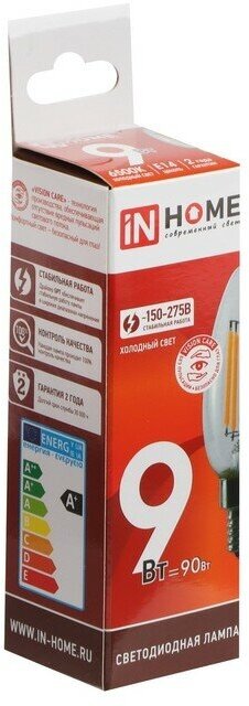 Лампа светодиодная IN HOME LED-СВЕЧА-deco, 9 Вт, 230 В, Е14, 6500 К, 1040 Лм, прозрачная