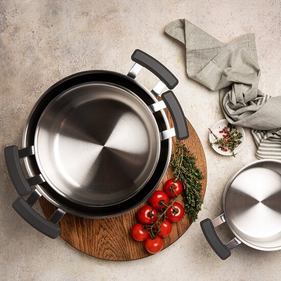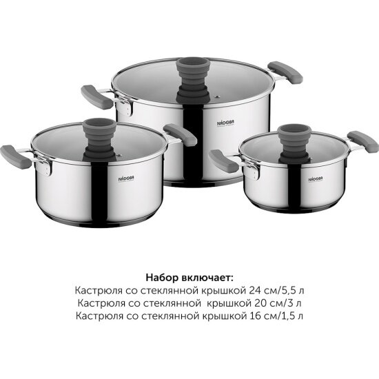 | Комплектация | кастрюля с крышкой 5,8 л/24 см, кастрюля с крышкой 3,2 л/20 см, кастрюля с крышкой 1,5 л/16 см |
