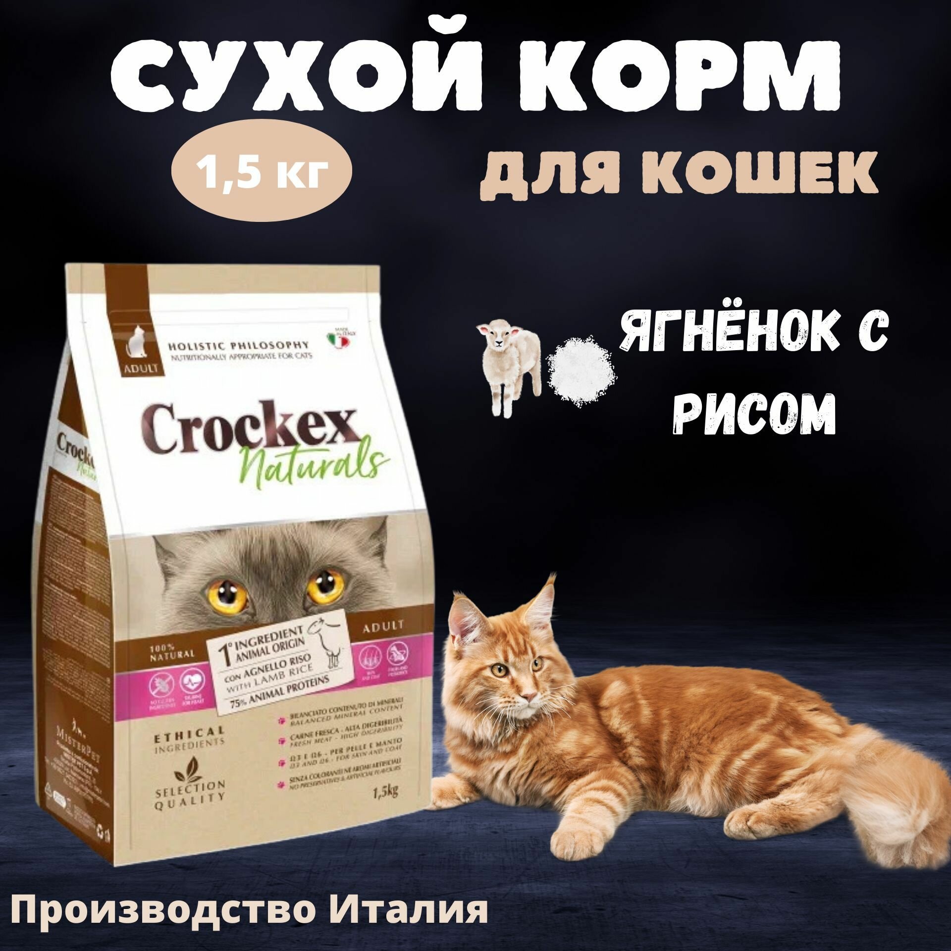 Crockex корм для кошек, ягненок с рисом 1,5 кг