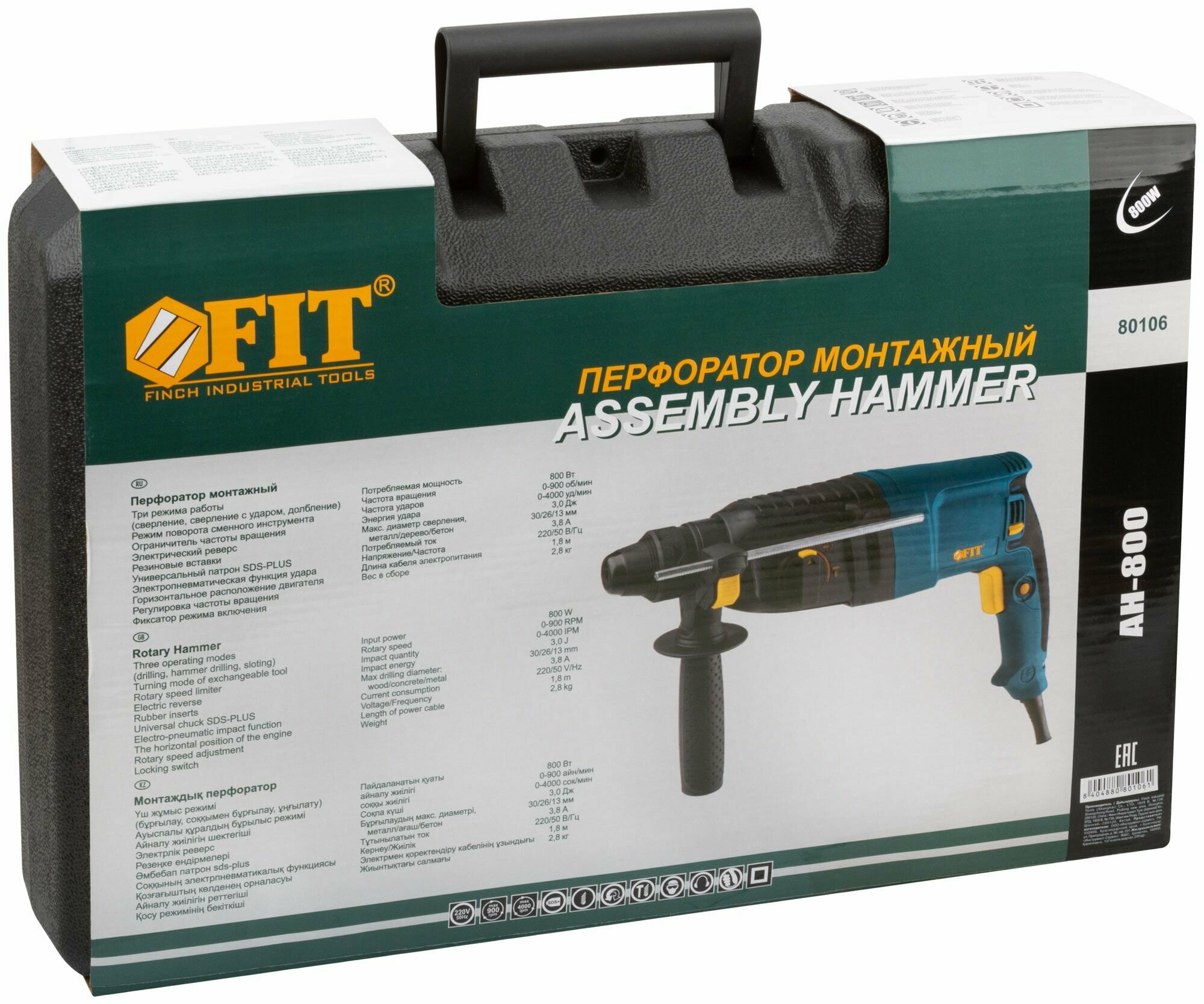 Перфоратор монтажный 800 Вт, 0-900 об/мин, 0-4000 уд/мин, 3,0 Дж, 3 реж., SDS-plus, реверс, 2,8 кг, кейс FIT