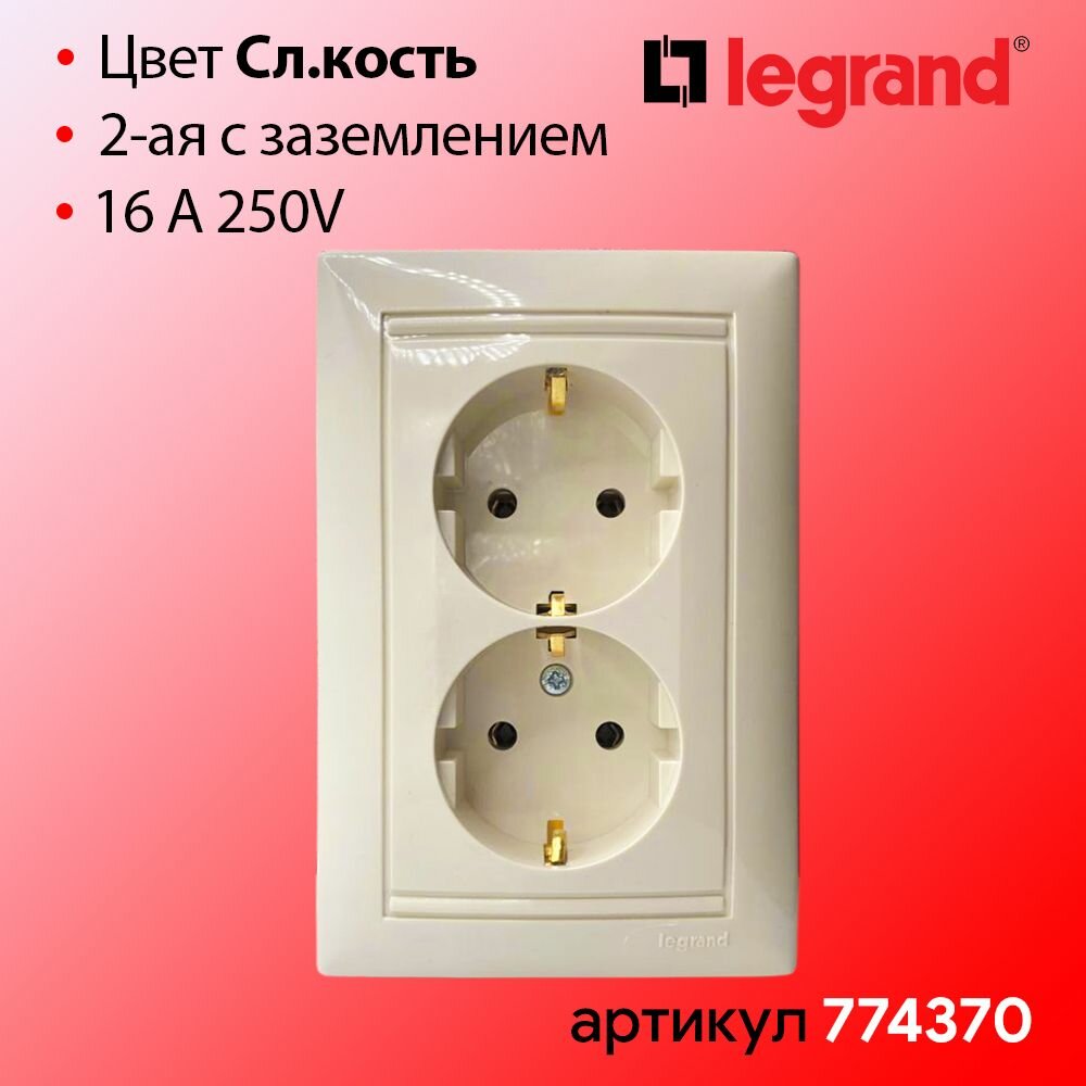 Розетка 2-м СП Valena 16А IP20 2х2P+E с заземл. немецк. стандарт в сборе сл. кость Leg, LEGRAND 774370 (1 шт.)
