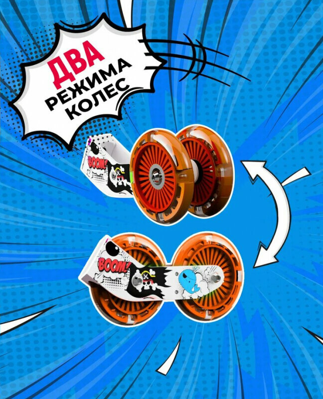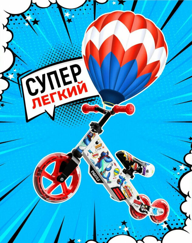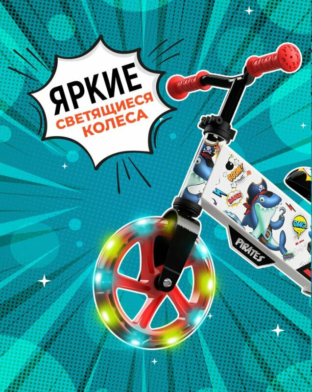 | Дополнительная информация | светящиеся колеса; трансформация задних колес — друг за другом или параллельно; рукоятки резиновые 11 см; длина беговела 76 см |