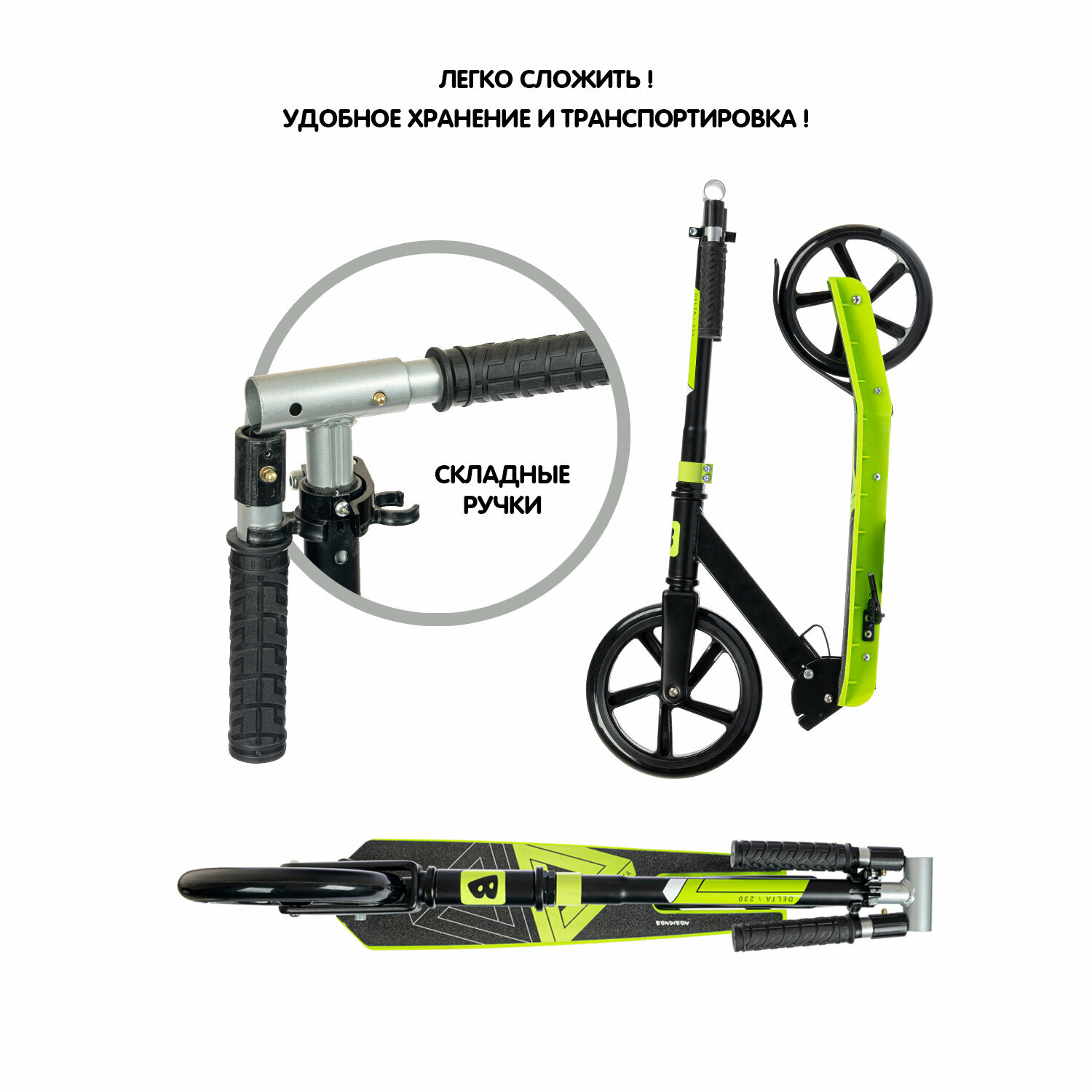 Самокат детский BONDIBON DELTA сталь+пластик, складной, колеса PU 230х200мм, зеленый