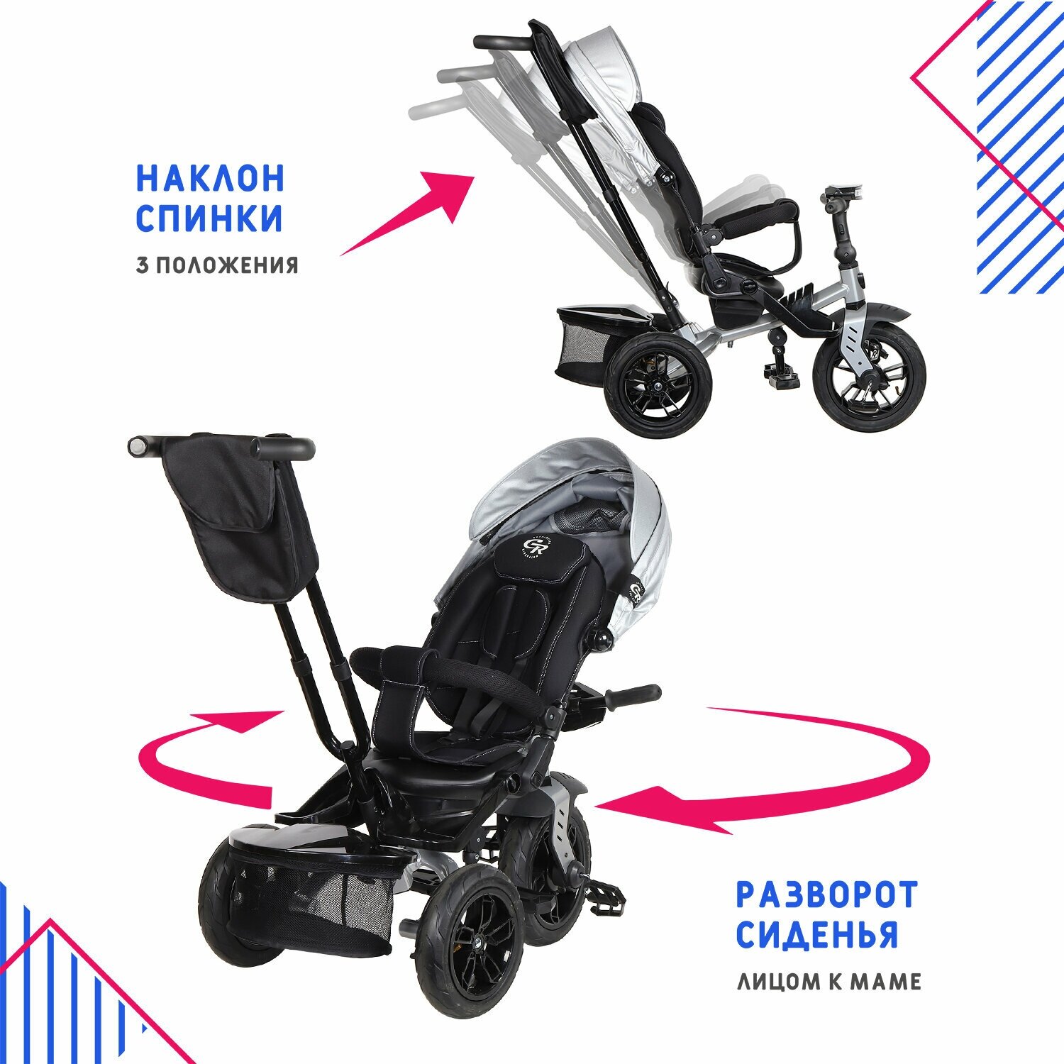 | Дополнительная информация | багажник - комплектация возможна в 2 х вариантах: с корзиной для хранения игрушек или с мягким рюкзачком, поворотное сиденье 360 градусов: лицом к маме и лицом по ходу движения, сиденье разворачивается 2-мя кнопками, 3 угла наклона спинки, максимальный наклон - 150 градусов; родительская ручка управления регулируется по высоте, руль складной |