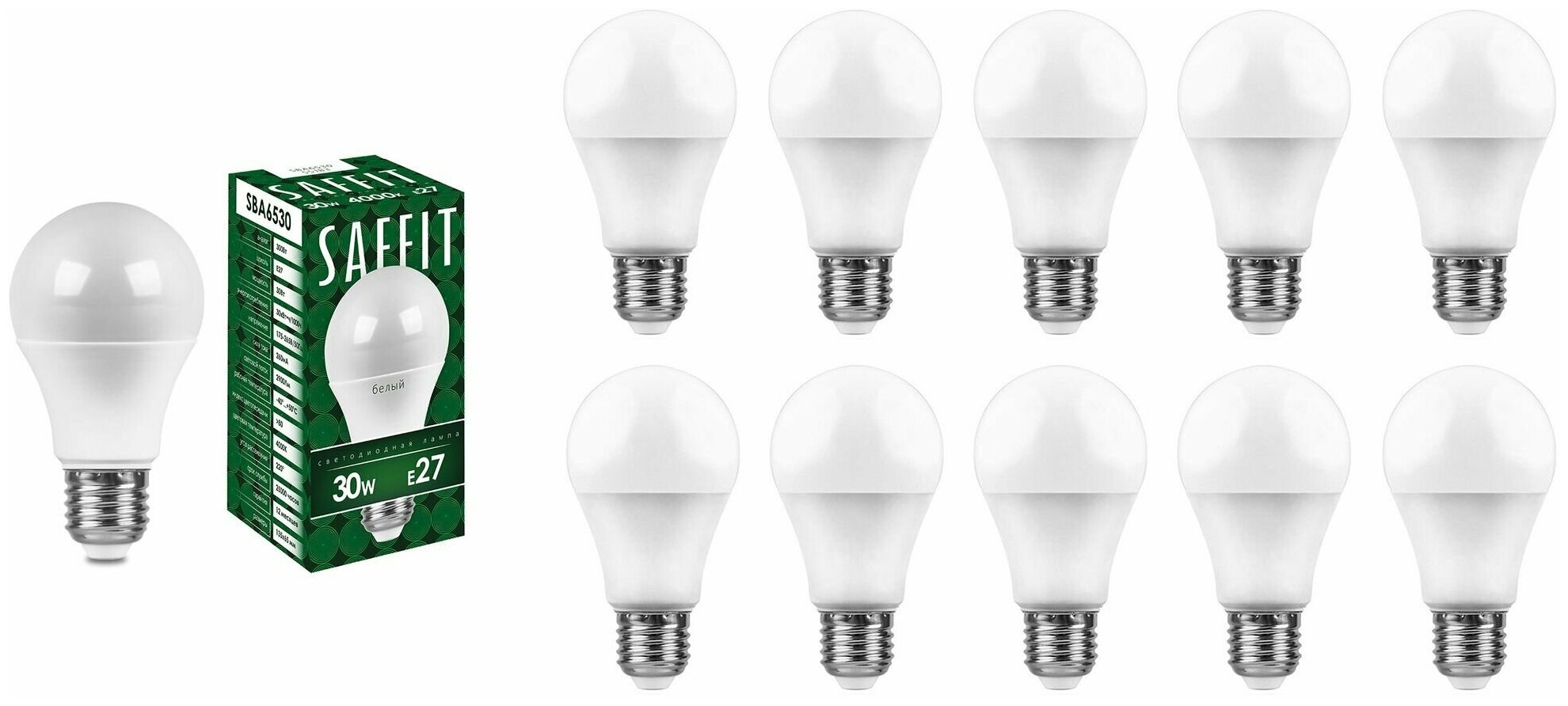 Лампочка светодиодная Saffit 30W=300W 230V E27 Груша A65 2900Лм Ra>80 2700К, упаковка 10шт. интересное: