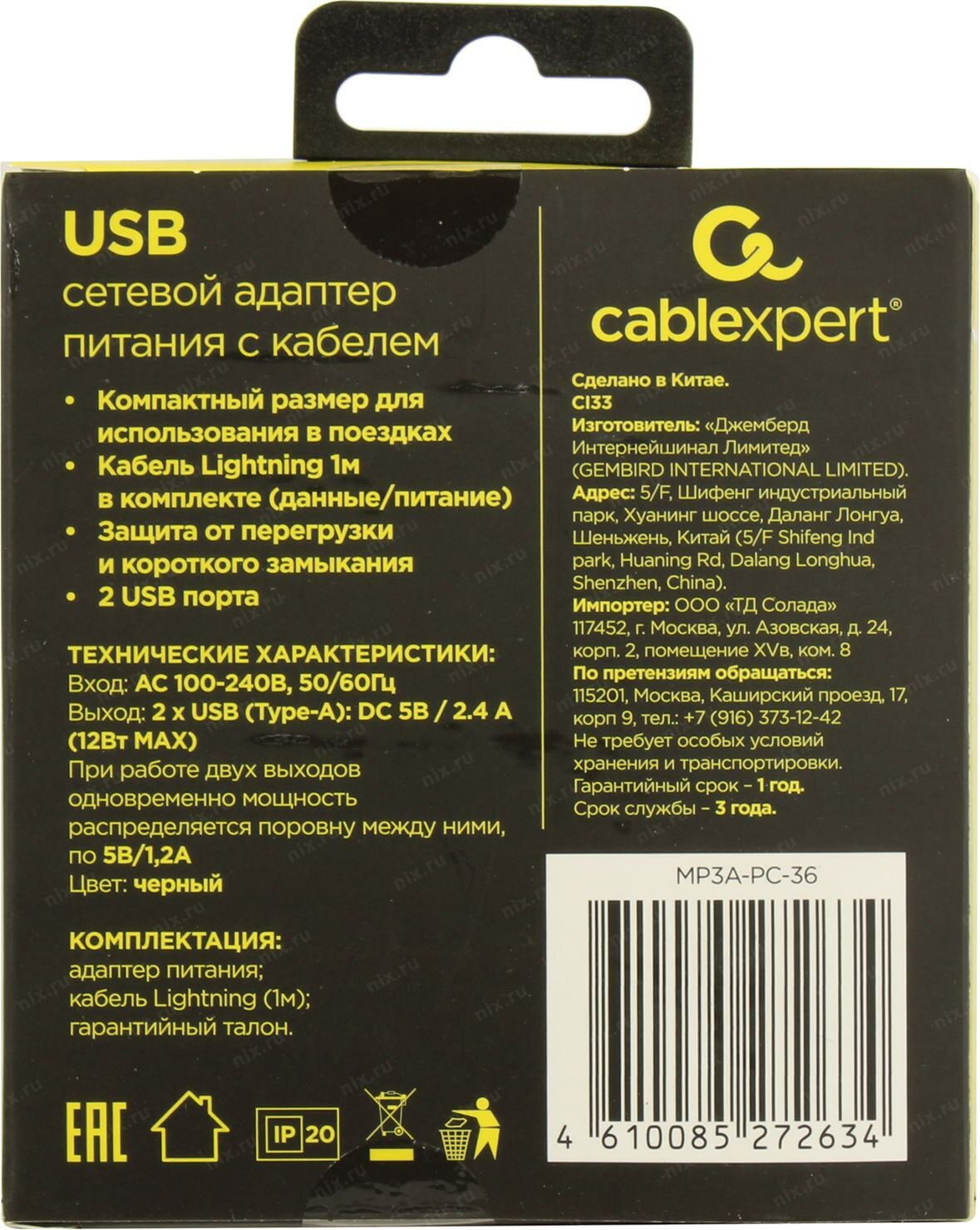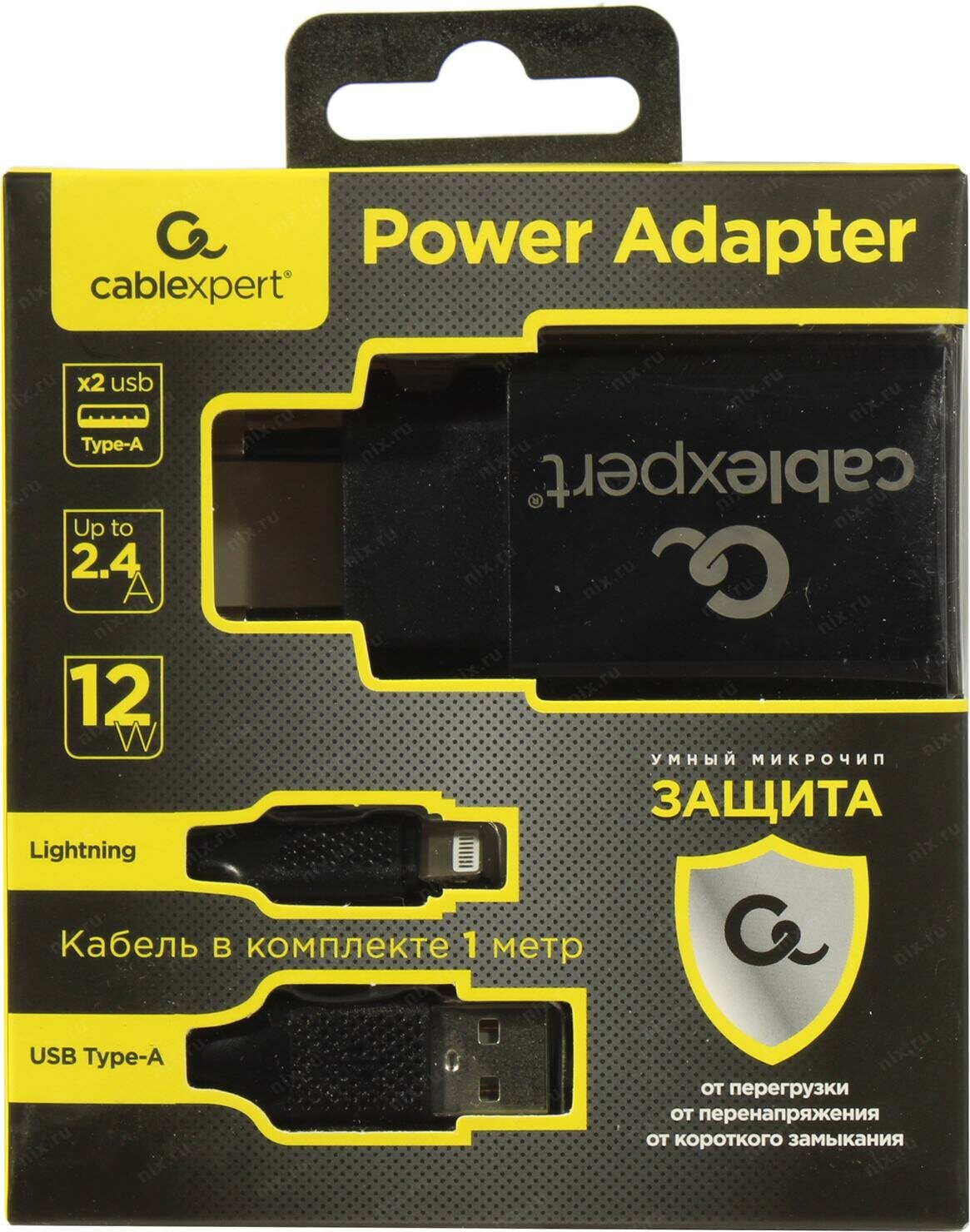 Купить Адаптер питания Cablexpert MP3A-PC-36 USB 2 порта, 2.4 A, черный + кабель 1 м lightning