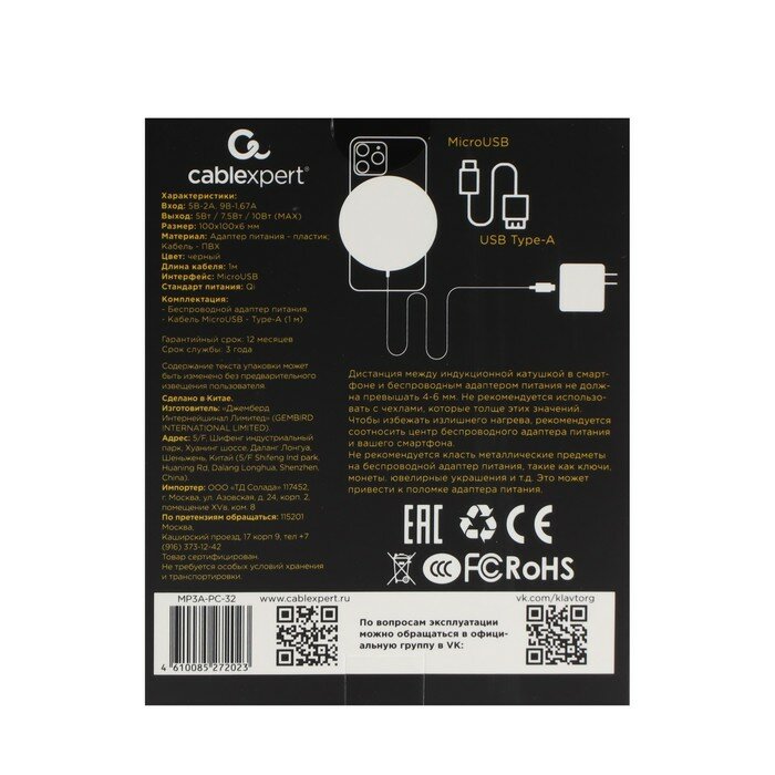Беспроводное зарядное устройство Cablexpert MP3A-PC-32, 10 Вт, 3 А, черное интересное:
