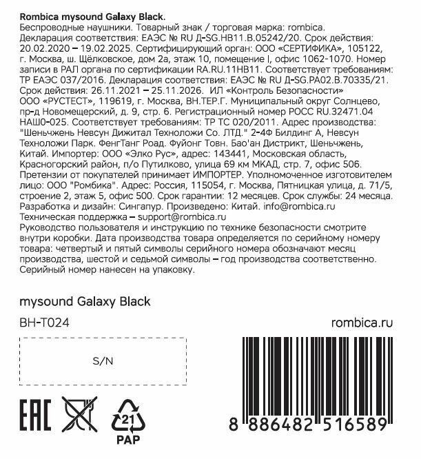 Купить Наушники True Wireless Rombica mySound Galaxy Black (BH-T024)