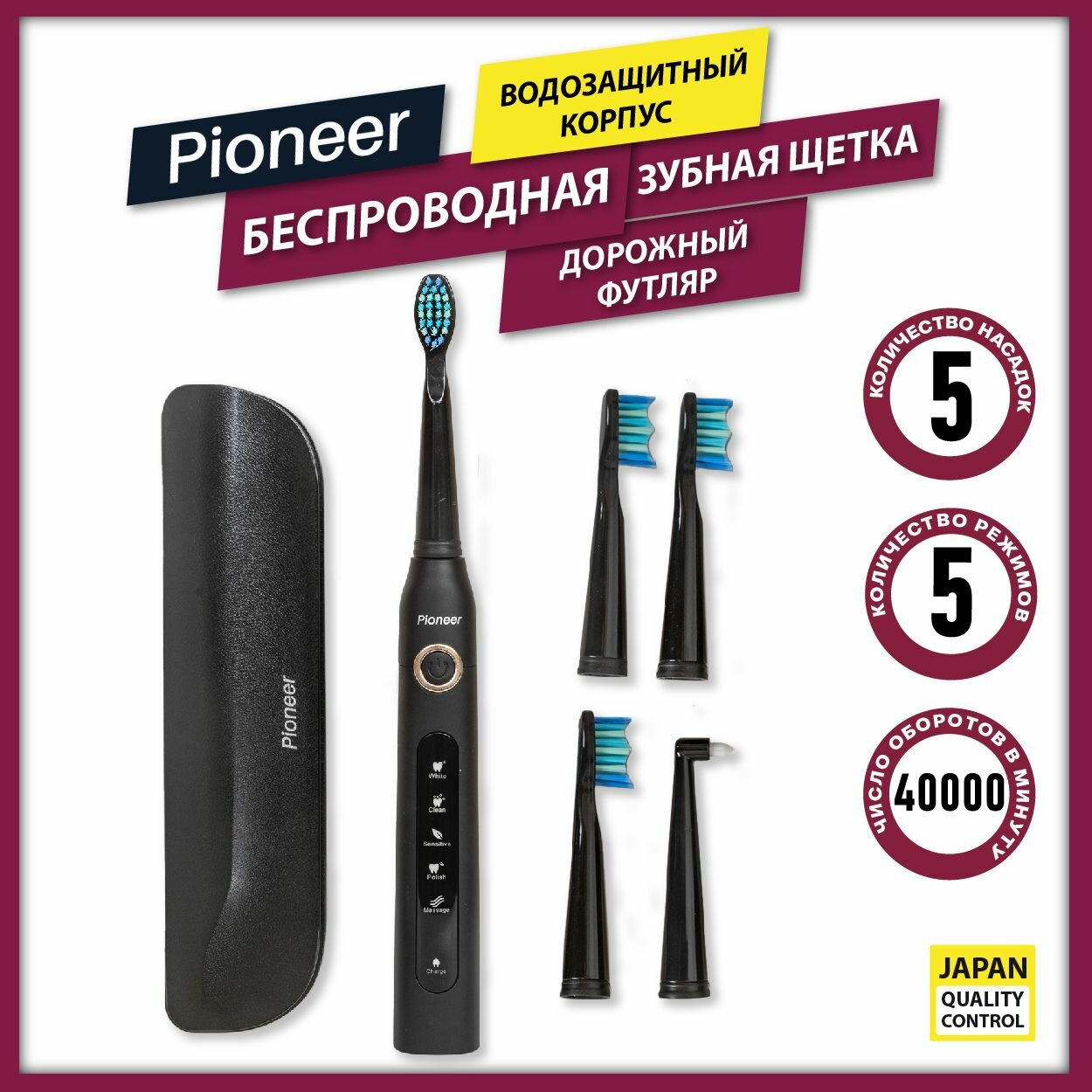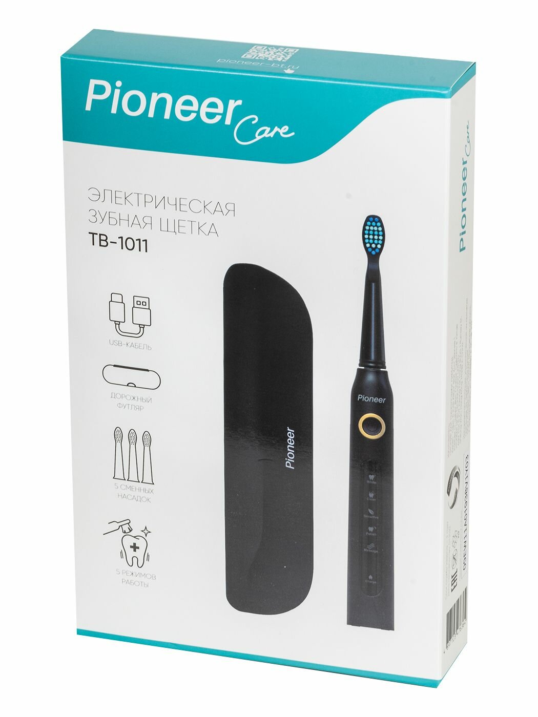 Электрическая зубная щетка Pioneer TB-1011 с водонепроницаемым корпусом IPX7, 5 сменных насадок, USB кабель, 5 режимов