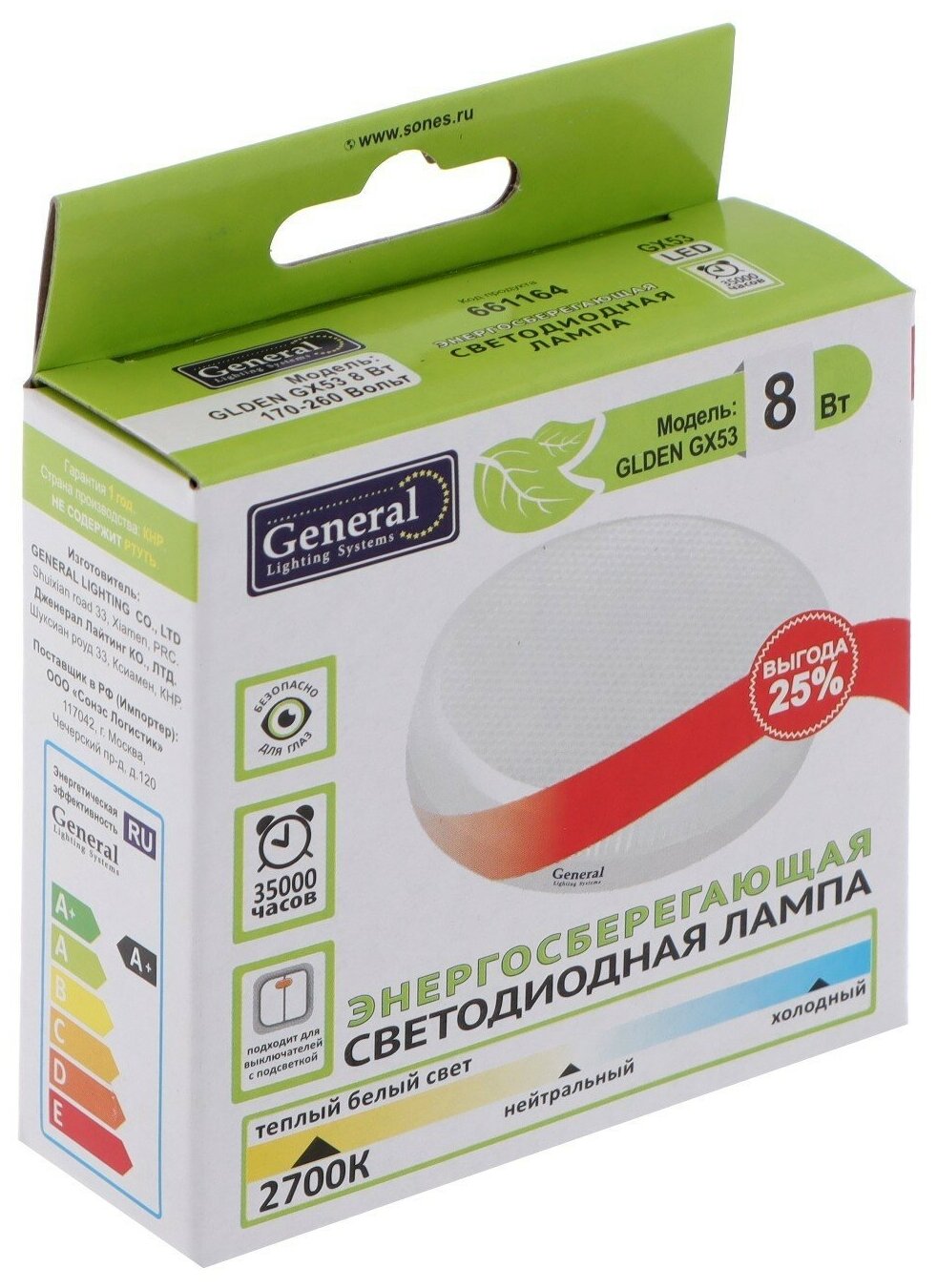 Лампа светодиодная GENERAL GLDEN, GX53, 8 Вт, 230 В, 2700 К, 540 Лм интересное: