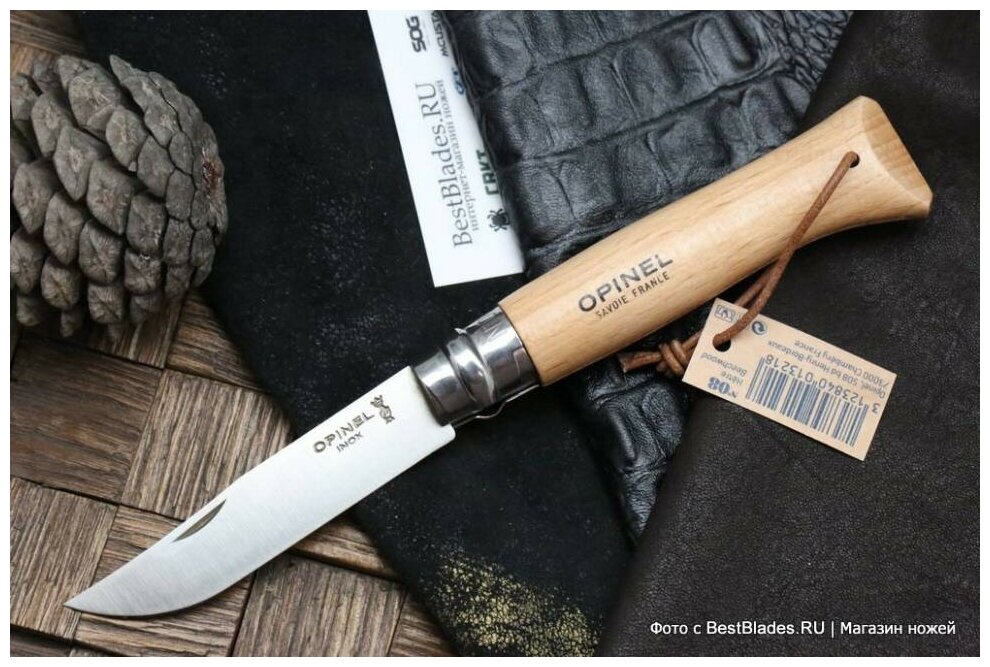 Нож Opinel №8, нержавеющая сталь, бук, с кожаным темляком интересное: