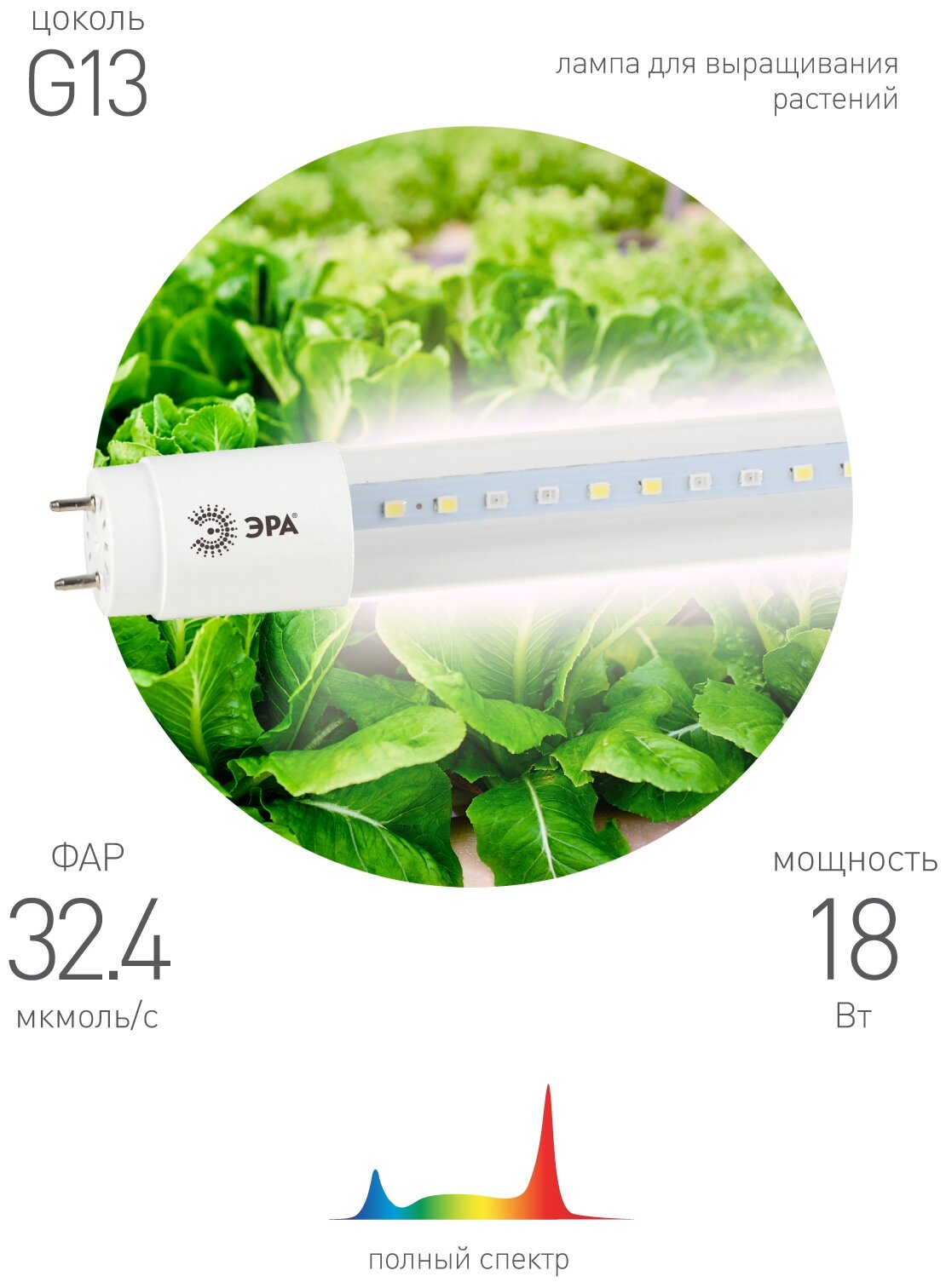 Лампа светодиодная для растений ЭРА Б0042987, G13, T8, 18 Вт, 1200 К